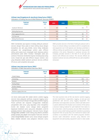 Utilisasi Jasa Pengeboran & Jasa Kerja Ulang Sumur (DWO)Utilization of Drilling Services & Well Workover Services (DWO)DeskripsiSubjectSatuanUnit 2023 2022 Kenaikan (Penurunan)Increase (Decrease)Hydraulic Workover % 89 94 (5) %uf0e2Drilling Rig Services % 100 100 - %uf0e2Mud Logging Services % 92 100 (8) %uf0e2H2S Services % 95 100 (5) %uf0e2Drilling Fluid Services % 92 100 (8) %uf0e2DWO memberikan jasa layanan di bidang drilling & workoverservices dengan fokus pada on-shore drilling sesuai dengan kompetensi dan alat yang dimiliki, namun tetap melakukan penjajakan dan pengembangan potensi pada offshoredrilling serta panas bumi mengingat masih besarnya potensi pertumbuhan pada sektor tersebut. Sedangkan pada jasa workover, Perseroan memberikan layanan di bidang kerja ulang sumur minyak dan gas, baik offshore maupun onshore. Jasa yang ditawarkan adalah hydraulic workover services, artificial lift service, well complation dan power.DWO provides services in the field of drilling & workover with a focus on onshore drilling in accordance with its competencies and equipment, but it still explores and develops potentials in offshore drilling and geothermal considering the large growth potential in the sector. Meanwhile, in workover services, the Company provides services in the field of oil and gas well rework, both offshore and onshore. The services offered are hydraulic workover services, artificial lift service, well completion and power.Utilisasi Jasa intervensi Sumur (WLI)Utilization of Well Intervention Services (WLI)DeskripsiSubjectSatuanUnit 2023 2022 Kenaikan (Penurunan)Increase (Decrease)Coiled Tubing % 100 100 -Cementing % 65 100 (35) %uf0e2Slickline % 72 81 (9) %uf0e2Testing Barge % 100 95 5 %uf0e1Surface Testing % 100 100 -Drill Stem % 100 100 -Wireline Logging Services % 79 99 (20) %uf0e2Lini bisnis utama pada WLI adalah electric wireline logging services (Jasa pelayanan perforasi, evaporasi logging sumur migas dan panas bumi dengan menggunakan peralatan logging. Proses perforasi dan evaporasi menggunakan melakukan pengambilan data sumur yang digunakan untuk mengetahui kondisi dan keadaan sumur sebagai bahan pengambil keputusan treatment sumur yang perlu dikerjakan), coiled & pumping services (Jasa pelayanan intervensi Sumur dengan menggunakan peralatan coiled tubing yang dibantu peralatan pompa-pompa yang dapat memompakan fluida dan chemicaluntuk mengembalikan kondisi sumur sesuai dengan program klien), slickline services (Jasa pelayanan intervensi sumur The main business lines at WLI are electric wireline loggingservices (perforation, evaporation, logging, oil and gas and geothermal well services using logging equipment. The perforation and evaporation process collects well data which is used to determine the situation and condition of the well as a decision-making material for well treatment that needs to be conducted), coiled & pumping services (Well intervention services using coiled tubing equipment assisted by pumping equipment that can pump fluid, and chemical to restore well condition in accordance with the client%u2019s program), slickline services (well intervention services using Slikcline Unit equipment and well auxiliary equipment used to clean scales 196 Laporan Tahunan %u2022 PT Pertamina Hulu EnergiPEMBAHASAN DAN ANALISIS MANAJEMENMANAGEMENT DISCUSSION AND ANALYSIS 4 5 6 7