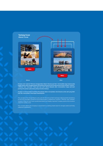 PULLPULLBeforeTentang CoverAbout CoverAfterKonsep cover Laporan Tahunan menggunakan teknik \bagian depan yang menggambarkan para pekerja Pertamina Hulu Energi secara urutan di lokasi %u201conshore%u201d, %u201coffshore%u201d dan %u201coverseas%u201d. Pada saat tuas %u201cpull%u201d ditarik kebawah akan menampilkan image aset-aset penting Perusahaan pada lokasi pekerja tersebut bekerja.Konsep ini mencerminkan komitmen Perusahaan dalam menciptakan nilai bersama untuk aset yang lebih kuat dan mewujudkan masa depan berkelanjutan.The concept of the Annual Report cover uses the \rations on the front that depict Pertamina Hulu Energi workers in sequence at \rseas\locations. When the \locations where the workers work.This concept reflects the Company's commitment to creating shared value for stronger assets and finally catalyzing sustainability.