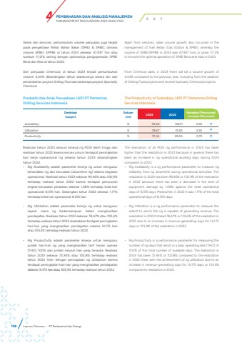 DeskripsiSubjectSatuanUnit 2023 2022 Kenaikan (Penurunan)Increase (Decrease)Availability % 99,46 98,51 0,95 %uf0e1Utilization % 78,47 75,92 2,55 %uf0e1Productivity % 72,34 69,55 2,79 %uf0e1Realisasi tahun 2023 seluruh kinerja rig PDSI lebih tinggi dari realisasi tahun 2022 karena secara umum terdapat peningkatan hari kerja operasional rig selama tahun 2023 dibandingkan tahun 2022.%u2022 Rig Availability adalah parameter kinerja rig untuk mengukurkehandalan rig dari kerusakan (downtime rig) selama kegiatanoperasional. Realisasi tahun 2023 sebesar 99,46% atau 100,9%terhadap realisasi tahun 2022 karena terdapat penurunantingkat kerusakan peralatan sebesar 1,08% terhadap total harioperasional 8.376 hari. Sedangkan tahun 2022 sebesar 1,17%terhadap total hari operasional 8.355 hari.%u2022 Rig Utilization adalah parameter kinerja rig untuk mengukursejauh mana rig berkemampuan dalam menghasilkanpendapatan. Realisasi tahun 2023 sebesar 78,47% atau 102,6%terhadap realisasi tahun 2022 disebabkan terdapat peningkatan hari-hari yang menghasilkan pendapatan selama 13.175 hariatau 103,3% terhadap realisasi tahun 2022.%u2022 Rig Productivity adalah parameter kinerja untuk mengukurjumlah hari-hari rig yang menghasilkan tarif harian operasi(THO) 100% dari jumlah seluruh hari yang tersedia. Realisasitahun 2023 sebesar 72,34% atau 102,8% terhadap realisasitahun 2022 linier dengan pencapaian rig utilization karenaterdapat peningkatan hari-hari yang menghasilkan pendapatanselama 13.175 hari atau 103,3% terhadap realisasi tahun 2022.The realization of all PDSI rig performance in 2023 has been higher than the realization in 2022 because in general there has been an increase in rig operational working days during 2023 compared to 2022.%u2022 Rig Availability is a rig performance parameter to measure rigreliability from rig downtime during operational activities. Therealization in 2023 has been 99.46% or 100.9% of the realization in 2022 because there has been a decrease in the level ofequipment damage by 1.08% against the total operationaldays of 8,376 days. Meanwhile, in 2022 it was 1.17% of the totaloperational days of 8,355 days.%u2022 Rig Utilization is a rig performance parameter to measure theextent to which the rig is capable of generating revenue. Therealization in 2023 totaled 78.47% or 102.6% of the realization in 2022 due to an increase in revenue-generating days for 13,175days or 103.3% of the realization in 2022.%u2022 Rig Productivity is a performance parameter for measuring thenumber of rig days that result in a daily operating rate (THO) of100% of the total number of available days. The realization in2023 has been 72.34% or 102.8% compared to the realizationin 2022 linear with the achievement of rig utilization due to anincrease in revenue-generating days for 13,175 days or 103.3%compared to realization in 2022.Selain dari services, pertumbuhan volume penjualan juga terjadi pada pengelolaan Retail Bahan Bakar (SPBU & SPBE), dimana volume SPBE/ SPPBE di tahun 2023 sebesar 47.937 Ton atau tumbuh 11,12% seiring dengan optimalnya pengoperasian SPBE Bima dan Nias di tahun 2023.Dari penjualan Chemical, di tahun 2023 terjadi pertumbuhan volume 4,44% dibandingkan tahun sebelumnya antara lain dari penambahan project Drilling Fluid dan beberapa project Specialty Chemical.Apart from services, sales volume growth also occurred in the management of Fuel Retail (Gas Station & SPBE), whereby the volume of SPBE/SPPBE in 2023 was 47,937 tons or grew 11.12% in line with the optimal operation of SPBE Bima and Nias in 2023.From Chemical sales, in 2023 there will be a volume growth of 4.44% compared to the previous year, including from the addition of Drilling Fluid projects and several Specialty Chemical projects.Produktivitas Anak Perusahaan (AP) PT Pertamina Drilling Services IndonesiaThe Productivity of Subsidiary (AP) PT Pertamina Drilling Services Indonesia198 Laporan Tahunan %u2022 PT Pertamina Hulu EnergiPEMBAHASAN DAN ANALISIS MANAJEMENMANAGEMENT DISCUSSION AND ANALYSIS 4 5 6 7