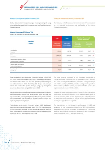 Total pendapatan yang dibukukan Perseroan sebesar USD823,62 juta, turun 0,5% dibandingkan tahun 2022 disebabkan oleh selisih kurs dimana tahun 2023 kurs rata-rata Rp15.255/USD sedangkan kurs rata-rata tahun 2022 Rp14.871/USD. Begitu pula dengan beban dan pendapatan (beban lainnya) yang juga mengalami penurunan dalam mata uang USD di tahun 2023.Namun dalam denominasi Rupiah, pencatatan keuangan Perseroan masih mengalami peningkatan dibandingkan tahun lalu baik dari segi pendapatan, beban, pendapatan (beban) lainnya maupun laba bersih disebabkan oleh kenaikan di segmen jasa hulu migas dan segmen jasa penunjang migas.Peningkatan performance Perseroan tahun 2023 disebabkan oleh meningkatnya aktivitas pada bisnis EPC-OM, meningkatnya productivity pada peralatan di Well services & Workover servicesserta meningkatnya productivity diseluruh bisnis jasa penunjang migas baik di SCU, PND, EFK maupun ETSA. The total revenue recorded by the Company amounted to USD823.62 million, a decrease of 0.5% compared to 2022, primarily due to the exchange rate difference, where the average exchange rate in 2023 was Rp15,255/USD, while the average exchange rate in 2022 was Rp14,871/USD. Similarly, expenses and other income also experienced a decrease in USD in 2023.However, in Rupiah denomination, the Company%u2019s financial records still showed an increase compared to the previous year in terms of revenue, expenses, other income (expenses), and net profit, driven by the growth in the upstream oil and gas service segment and the oil and gas support service segment.The improvement in the Company%u2019s performance in 2023 was attributed to the increased activities in the EPC-OM business, improved productivity in equipment for Well services & Workover services, and enhanced productivity across all oil and gas support service businesses in SCU, PND, EFK, and ETSA.Kinerja Keuangan PT Elnusa TbkFinancial Performance of PT Elnusa TbkDeskripsiSubject2023 2022 Kenaikan (Penurunan)Increase (Decrease)(USD-juta)(USD-million)(USD-juta)(USD-million)Nominal(USD-juta)(USD-million)PersentasePercentage(%)PendapatanIncome 823,62 827,52 (3,90) (0,47) %uf0e2BebanExpenses (778,44) (793,09) 14,65 (1,85) %uf0e2Pendapatan (Beban) LainnyaOther Income (Expense) (2,81) (2,00) 0,80 (24,50) %uf0e1Beban Pajak PenghasilanIncome Tax Expense (9,41) (7,32) (2,09) 28,55 %uf0e1Laba BersihNet Profit 32,98 25,11 7,87 31,34 %uf0e1Kinerja Keuangan Anak Perusahaan (AP)Berikut disampaikan kinerja keuangan masing-masing AP yang terkonsolidasikan pada kinerja keuangan dan profitabilitas segmen Operasi Lainnya.Financial Performance of Subsidiaries (AP)The following is the financial performance of each AP consolidated on the financial performance and profitability of the Other Operations segments.200 Laporan Tahunan %u2022 PT Pertamina Hulu EnergiPEMBAHASAN DAN ANALISIS MANAJEMENMANAGEMENT DISCUSSION AND ANALYSIS 4 5 6 7