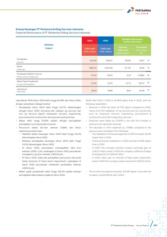Kinerja Keuangan PT Pertamina Drilling Services IndonesiaFinancial Performance of PT Pertamina Drilling Services IndonesiaDeskripsiSubject2023 2022 Kenaikan (Penurunan)Increase (Decrease)(USD-juta)(USD-million)(USD-juta)(USD-million)Nominal(USD-juta)(USD-million)PersentasePercentage(%)PendapatanIncome 424,36 340,27 84,90 24,61 %uf0e1BebanExpenses (386,12) (314,40) (71,72) 22,81 %uf0e1Pendapatan (Beban) LainnyaOther Income (Expense) (2,30) (2,67) 0,37 (13,86) %uf0e2Beban Pajak PenghasilanIncome Tax Expense (7,42) (3,31) (4,11) 124,17 %uf0e1Laba BersihNet Profit 28,52 19,89 8,63 43,39 %uf0e1Laba Bersih PDSI tahun 2023 lebih tinggi 42,39% dari tahun 2022, dengan penjelasan sebagai berikut:%u2022 Pendapatan tahun 2023 lebih tinggi 24,71% dibandingkan dengan tahun 2022, terutama dari realisasi rig services dan non rig services seperti manpower services, engineering, procurement & construction dan jasa penunjang lainnya.%u2022 Beban lebih tinggi 22,81% sejalan dengan peningkatan pendapatan (cost generate revenue).%u2022 Penurunan beban lain-lain sebesar 13,86% dari tahun sebelumnya terdiri atas:- Realisasi beban keuangan tahun 2023 lebih tinggi 44,5% dibandingkan tahun 2022.- Realisasi pendapatan keuangan tahun 2023 lebih tinggi 53,5% dibandingkan tahun 2022.- Di tahun 2023, perusahaan mendapatkan laba kurs sebesar USD0,1 juta, sedangkan di tahun 2022 perusahaan mengalami rugi kurs sebesar USD4,8 juta.- Di tahun 2023, tidak ada pembalikan penurunan nilai asset tetap (reversal of fixed asset impairment), sedangkan di tahun 2022 perusahaan melakukan pembalikan sebesar USD3,9 juta.%u2022 Beban pajak penghasilan lebih tinggi 124,2% sejalan dengan peningkatan laba sebelum pajak di tahun 2023.PDSI%u2019s Net Profit in 2023 is 42.39% higher than in 2022, with the following explanation:%u2022 Revenue in 2023 has been 24.71% higher compared to 2022, mainly from the realization of rig services and non-rig services such as manpower services, engineering, procurement & construction and other supporting services.%u2022 Expenses were higher by 22.81% in line with the increase in revenue (cost generate revenue).%u2022 The decrease in other expenses by 13.86% compared to the previous year consisted of the following:- The realization of financial expenses in 2023 has been 44.5% higher than in 2022.- Financial revenue realization in 2023 has been 53.5% higher than in 2022.- In 2023, the company earned a foreign exchange gain of USD0.1 million, while in 2022 the company suffered a foreign exchange loss of USD4.8 million.- In 2023, there was no reversal of fixed asset impairment, while in 2022 the company made a reversal of USD3.9 million.%u2022 The income tax expense has been 124.2% higher in line with the increase in profit before tax in 2023.PT Pertamina Hulu Energi %u2022 Annual Report 201