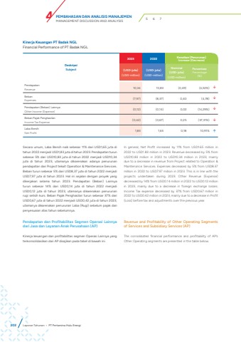 Pendapatan dan Profitabilitas Segmen Operasi Lainnya dari Jasa dan Layanan Anak Perusahaan (AP)Kinerja keuangan dan profitabilitas segmen Operasi Lainnya yang terkonsolidasikan dari AP disajikan pada tabel di bawah ini.Revenue and Profitability of Other Operating Segments of Services and Subsidiary Services (AP)The consolidated financial performance and profitability of AP%u2019s Other Operating segments are presented in the table below.Kinerja Keuangan PT Badak NGLFinancial Performance of PT Badak NGLDeskripsiSubject2023 2022 Kenaikan (Penurunan)Increase (Decrease)(USD-juta)(USD-million)(USD-juta)(USD-million)Nominal(USD-juta)(USD-million)PersentasePercentage(%)PendapatanRevenue 10,34 10,83 (0,49) (4,52%) %uf0e2BebanExpenses (7,97) (8,37) 0,40 (4,78) %uf0e2Pendapatan (Beban) LainnyaOther Income (Expense) (0,12) (0,14) 0,02 (14,29%) %uf0e2Beban Pajak PenghasilanIncome Tax Expense (0,42) (0,67) 0,25 (37,31%) %uf0e2Laba BersihNet Profit 1,83 1,65 0,18 10,91% %uf0e1Secara umum, Laba Bersih naik sebesar 11% dari USD1,65 juta di tahun 2022 menjadi USD1,83 juta di tahun 2023. Pendapatan turun sebesar 5% dari USD10,83 juta di tahun 2022 menjadi USD10,34 juta di tahun 2023, utamanya dikarenakan adanya penurunan pendapatan dari Project tekait Operation & Maintenance Services. Beban turun sebesar 5% dari USD8,37 juta di tahun 2022 menjadi USD7,97 juta di tahun 2023. Hal ini sejalan dengan proyek yang dikerjakan selama tahun 2023. Pendapatan (Beban) Lainnya turun sebesar 14% dari USD0,14 juta di tahun 2022 menjadi USD0,12 juta di tahun 2023, utamanya dikarenakan penurunan rugi selisih kurs. Beban Pajak Penghasilan turun sebesar 37% dari USD0,67 juta di tahun 2022 menjadi USD0,42 juta di tahun 2023, utamanya dikarenakan penurunan Laba (Rugi) sebelum pajak dan penyesuaian atas tahun sebelumnya.In general, Net Profit increased by 11% from USD1.65 million in 2022 to USD1.83 million in 2023. Revenue decreased by 5% from USD10.83 million in 2022 to USD10.34 million in 2023, mainly due to a decrease in revenue from Project related to Operation & Maintenance Services. Expenses decreased by 5% from USD8.37 million in 2022 to USD7.97 million in 2023. This is in line with the projects undertaken during 2023. Other Revenue (Expense) decreased by 14% from USD0.14 million in 2022 to USD0.12 million in 2023, mainly due to a decrease in foreign exchange losses. Income Tax expense decreased by 37% from USD0.67 million in 2022 to USD0.42 million in 2023, mainly due to a decrease in Profit (Loss) before tax and adjustments over the previous year.202 Laporan Tahunan %u2022 PT Pertamina Hulu EnergiPEMBAHASAN DAN ANALISIS MANAJEMENMANAGEMENT DISCUSSION AND ANALYSIS 4 5 6 7