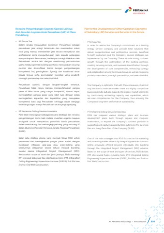 Rencana Pengembangan Segmen Operasi Lainnya dari Jasa dan Layanan Anak Perusahaan (AP) di Masa Mendatang%u2022 PT Elnusa TbkDalam rangka mewujudkan komitmen Perusahaan sebagai perusahaan jasa energi terkemuka dan memberikan solusi total yang mampu memberikan jasa secara menyeluruh dan professional serta menguntungkan baik kepada pelanggan maupun kepada Perusahaan, beberapa strategi dilakukan oleh Perusahaan antara lain dengan mendorong pertumbuhan usaha melalui optimasi existing portfolio, menciptakan recuring income dan diversifikasi bisnis dengan pengembangan kompetensi inti, peningkatan Synergi dan kolaborasi antar Elnusa Group serta peningkatan Investasi yang prudent, strategic partnership dan selective M&A. Perusahaan optimis, dengan langkah-langkah tersebut, Perusahaan tidak hanya mampu mempertahankan pangsa pasar di iklim bisnis yang sangat kompetitif, namun dapat meningkatkan pangsa pasar yang lebih luas dengan selalu meningkatkan kapasitas dan kapabilitas yang merupakan kompetensi baru bagi Perusahaan sehingga dapat menjaga keberlangsungan kinerja Perusahaan secara jangka panjang.%u2022 PT Pertamina Drilling Sevices IndonesiaPDSI telah menyiapkan berbagai rencana strategis dan rencana pengembangan bisnis baik melalui investasi organik maupun anorganik untuk memperluas portofolio bisnis perusahaan dalam mendukung dan menangkap peluang yang tertuang di dalam Business Plan dan Rencana Jangka Panjang Perusahaan (RJPP). Salah satu strategi utama yang menjadi fokus PDSI untuk pemasaran dan meningkatkan pangsa pasar adalah dengan melakukan integrasi jasa-jasa atau cross-selling yang sebelumnya ditawarkan secara satuan menjadi bundling melalui skema Integrated Project Management (IPM).Berdasarkan scope of work dan jenis jasanya, PDSI membagi IPM menjadi beberapa tipe diantaranya Semi IPM, Integrated Drilling Engineering Supervision Services (IDESS), Full IPM dan End-to-End Well Construction.Plan for the Development of Other Operation Segments of Subsidiary (AP) Services and Services in the Future%u2022 PT Elnusa TbkIn order to realize the Company%u2019s commitment as a leading energy service company and provide total solutions that deliver comprehensive and professional services, beneficial to both customers and the Company, several strategies are implemented by the Company. These include driving business growth through the optimization of the existing portfolio, creating recurring income, and business diversification through the development of core competencies, enhancing synergy and collaboration among the Elnusa Group, as well as increasing prudent investments, strategic partnerships, and selective M&A.The Company is optimistic that with these measures, it will not only be able to maintain market share in a highly competitive business climate but also expand into broader market segments by continuously enhancing capacity and capabilities, which are new competencies for the Company, thus ensuring the Company%u2019s long-term performance sustainability.%u2022 PT Pertamina Drilling Services IndonesiaPDSI has prepared various strategic plans and business development plans, both through organic and inorganic investments, to expand the company%u2019s business portfolio in supporting and capturing opportunities outlined in the Business Plan and Long-Term Plan of the Company (RJPP).One of the main strategies that PDSI focuses on for marketing and increasing market share is by integrating services or crossselling previously offered services individually into bundling through the Integrated Project Management (IPM) scheme. Based on the scope of work and types of services, PDSI divides IPM into several types, including Semi IPM, Integrated Drilling Engineering Supervision Services (IDESS), Full IPM, and End-toEnd Well Construction.PT Pertamina Hulu Energi %u2022 Annual Report 205