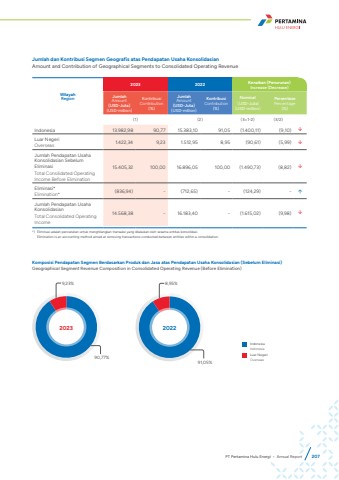 Jumlah dan Kontribusi Segmen Geografis atas Pendapatan Usaha Konsolidasian Amount and Contribution of Geographical Segments to Consolidated Operating Revenue2023 20228,95%91,05%Indonesia IndonesiaLuar NegeriOverseas9,23%90,77%Komposisi Pendapatan Segmen Berdasarkan Produk dan Jasa atas Pendapatan Usaha Konsolidasian (Sebelum Eliminasi)Geographical Segment Revenue Composition in Consolidated Operating Revenue (Before Elimination)WilayahRegion2023 2022 Kenaikan (Penurunan)Increase (Decrease)JumlahAmount(USD-Juta)(USD-million)KontribusiContribution(%)JumlahAmount(USD-Juta)(USD-million)KontribusiContribution(%)Nominal (USD-Juta)(USD-million)PersentasePercentage(%)(1) (2) (3=1-2) (3/2)Indonesia 13.982,98 90,77 15.383,10 91,05 (1.400,11) (9,10) %uf0e2Luar NegeriOverseas 1.422,34 9,23 1.512,95 8,95 (90,61) (5,99) %uf0e2Jumlah Pendapatan Usaha Konsolidasian Sebelum EliminasiTotal Consilidated Operating Income Before Elimination15.405,32 100,00 16.896,05 100,00 (1.490,73) (8,82) %uf0e2Eliminasi*Elimination* (836,94) - (712,65) - (124,29) - %uf0e1Jumlah Pendapatan Usaha KonsolidasianTotal Consolidated Operating Income14.568,38 - 16.183,40 - (1.615,02) (9,98) %uf0e2*) Eliminasi adalah pencatatan untuk menghilangkan transaksi yang dilakukan oleh sesama entitas konsolidasi.Elimination is an accounting method aimed at removing transactions conducted between entities within a consolidation.PT Pertamina Hulu Energi %u2022 Annual Report 207