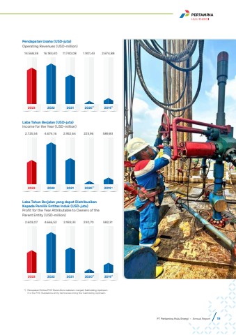PT Pertamina Hulu Energi %u2022 Annual Report 19Pendapatan Usaha (USD-juta)Operating Revenues (USD-million)14.568,38 16.183,40 11.740,08 1.901,43 2.674,88 2023 2022 2021 2020*) 2019*)Laba Tahun Berjalan (USD-juta)Income for the Year (USD-million)2.725,54 4.674,16 2.952,64 223,96 589,832023 2022 2021 2020*) 2019*)Laba Tahun Berjalan yang dapat Diatribusikan Kepada Pemilik Entitas Induk (USD-juta)Profit for the Year Attributable to Owners of the Parent Entity (USD-million)2.603,07 4.666,52 2.933,33 230,70 582,312023 2022 2021 2020*) 2019*)*) Merupakan Entitas PHE Stand Alone sebelum menjadi Subholding Upstream.It is the PHE Standalone entity before becoming the Subholding Upstream.