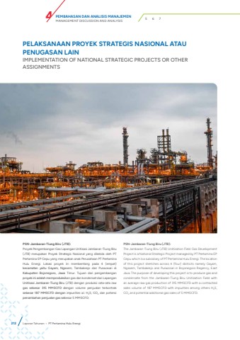 PELAKSANAAN PROYEK STRATEGIS NASIONAL ATAU PENUGASAN LAINIMPLEMENTATION OF NATIONAL STRATEGIC PROJECTS OR OTHER ASSIGNMENTSPSN-Jambaran-Tiung Biru (JTB):Proyek Pengembangan Gas Lapangan Unitisasi Jambaran-Tiung Biru (JTB) merupakan Proyek Strategis Nasional yang dikelola oleh PT Pertamina EP Cepu yang merupakan anak Perusahaan PT Pertamina Hulu Energi. Lokasi proyek ini membentang pada 4 (empat) kecamatan yaitu Gayam, Ngasem, Tambakrejo dan Purwosari di Kabupaten Bojonegoro, Jawa Timur. Tujuan dari pengembangan proyek ini adalah memproduksikan gas dan kondensat dari Lapangan Unitisasi Jambaran-Tiung Biru (JTB) dengan produksi rata-rata raw gas sebesar 315 MMSCFD dengan volume penjualan terkontrak sebesar 187 MMSCFD dengan impurities a.l. H2S, CO2 dan potensi penambahan penjualan gas sebesar 5 MMSCFD.PSN-Jambaran-Tiung Biru (JTB):The Jambaran-Tiung Biru (JTB) Unitization Field Gas Development Project is a National Strategic Project managed by PT Pertamina EP Cepu which is a subsidiary of PT Pertamina Hulu Energi. The location of this project stretches across 4 (four) districts namely Gayam, Ngasem, Tambakrejo and Purwosari in Bojonegoro Regency, East Java. The purpose of developing this project is to produce gas and condensate from the Jambaran-Tiung Biru Unitization Field with an average raw gas production of 315 MMSCFD with a contracted sales volume of 187 MMSCFD with impurities among others H2S, CO2 and potential additional gas sales of 5 MMSCFD.212 Laporan Tahunan %u2022 PT Pertamina Hulu EnergiPEMBAHASAN DAN ANALISIS MANAJEMENMANAGEMENT DISCUSSION AND ANALYSIS 4 5 6 7