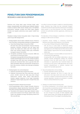 PENELITIAN DAN PENGEMBANGANRESEARCH AND DEVELOPMENTPertamina Hulu Energi dalam upaya mencapai target, selain dengan mengoptimalkan aset eksisting juga melakukan kegiatan investasi anorganik melalui akuisisi dengan tujuan meningkatkan pertumbuhan cadangan, produksi dan lifting migas, kegiatan divestasi dan kegiatan partnership secara agresif, selektif dan proaktif.Penjabaran strategi tersebut diwujudkan dalam 3 (tiga) strategi utama Fungsi UBD sebagai berikut:1. Strategi kegiatan akuisisi Dalam melakukan akuisisi, Pertamina Hulu Energi akan memperhatikan beberapa hal sebagai berikut:a. Fokus Area Strategi Merger & Acquisition (M&A) PHE akan fokus pada area berdasarkan footprint eksisting Pertamina: Indonesia, Southeast Asia dan Papua New Guinea, Irak, Algeria dan sekitar area Timur Tengah dan Afrika serta Peluang Strategis Global yang memberikan keunggulan ataupun nilai tambah.b. Peningkatan pendekatan Business-to-business (B2B) dan Government-to Government (G2G)Peningkatan hubungan B2B, G2G dan afiliasi juga merupakan strategi pengembangan bisnis hulu dan investasi anorganik, sehingga Fungsi UBD tidak hanya mendapatkan informasi peluang dari Investment Bank, namun juga akan lebih aktif dalam pendekatan B2B yang membutuhkan jaringan/forum bisnis atau business chamber serta dukungan pendekatan top leader. 2. Strategi kegiatan new venture/eksplorasi a. Eksplorasi domestik tetap menjadi fokus utama. b. Eksplorasi internasional akan fokus pada basin yang well proven, memiliki volume dan skala yang besar dengan keekonomian menarik. Selain kriteria teknis-ekonomi tersebut, kegiatan eksplorasi di luar negeri diutamakan dilakukan di negara-negara yang saat ini menjadi fokus area Pertamina.3. Strategi Penambahan Wilayah Kerja Domestik Untuk pengembangan usaha di wilayah Domestik, Pertamina memprioritaskan sebagai Operatorship. Penambahan Wilayah Kerja (WK) domestik dapat dibagi berdasarkan 2 cara, yaitu:a. Penambahan WK eksplorasi migas dapat dilakukan melalui proses direct proposal (Joint Study), regular tender, direct tender, dan pengajuan privilege Participating Interest (PI) 15% untuk WK baru. In an effort to achieve the target, in addition to optimizing existing assets, Pertamina Hulu Energi has also conducted inorganic investment activities through acquisitions with the aim of increasing reserve growth, oil and gas production and lifting, divestment activities and partnership activities aggressively, selectively and proactively.The elaboration of these strategies is manifested in 3 (three) main strategies of UBD Function as follows:1. Acquisition activity strategy. In conducting acquisitions, Pertamina Hulu Energi will pay attention to the following:a. Focus Area of Merger & Acquisition (M&A) StrategyPHE will focus on areas based on Pertamina%u2019s existing footprint: Indonesia, Southeast Asia and Papua New Guinea, Iraq, Algeria and in the Middle East and Africa area as well as Global Strategic Opportunities that provide advantages or added value.b. Improved Business-to-business (B2B) and Government-toGovernment (G2G) approaches Increasing B2B, G2G and affiliate relationships is also an upstream business development strategy and inorganic investment, hence the UBD function does not only get information on opportunities from Investment Banks, but it will also be more active in B2B approaches that require business networks/forums or business chambers and support from top leader approaches. 2. New venture/exploration activity strategy a. Domestic exploration remains a key focus. b. International exploration will focus on basins that are well proven, have large volume and scale with attractive economics. In addition to these technical-economic criteria, overseas exploration activities are prioritized in countries that are currently Pertamina%u2019s focus area.3. Strategy to Increase Domestic Working Area For business development in the domestic region, Pertamina sets its priorities as operatorship. Domestic Working Areas can be expanded in 2 ways, namely as follows:a. The addition of oil and gas exploration Working Areas can be done through the process of direct proposal (Joint Study), regular tender, direct tender, and submission of 15% Participating Interest (PI) privilege for new Working Areas. PT Pertamina Hulu Energi %u2022 Annual Report 215