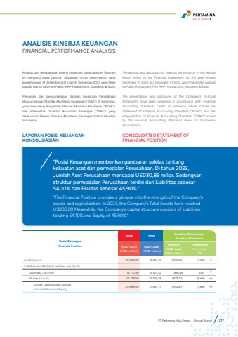 ANALISIS KINERJA KEUANGANFINANCIAL PERFORMANCE ANALYSISAnalisis dan pembahasan kinerja keuangan pada Laporan Tahunan ini mengacu pada Laporan Keuangan untuk tahun-tahun yang berakhir pada 31 Desember 2023 dan 31 Desember 2022 yang telah diaudit Kantor Akuntan Publik (KAP)Purwantono, Sungkoro & Surja.Penyajian dan pengungkapan laporan keuangan Perusahaan disusun sesuai Standar Akuntansi Keuangan (%u201cSAK%u201d) di Indonesia, yang mencakup Pernyataan Standar Akuntansi Keuangan (%u201cPSAK%u201d), dan lnterpretasi Standar Akuntansi Keuangan (%u201cISAK%u201d) yang dikeluarkan Dewan Standar Akuntansi Keuangan lkatan Akuntan Indonesia.LAPORAN POSISI KEUANGAN KONSOLIDASIANThe analysis and discussion of financial performance in this Annual Report refers to the Financial Statements for the years ended December 31, 2023, and December 31, 2022, which have been audited by Public Accountant Firm (KAP) Purwantono, Sungkoro & Surja.The presentation and disclosure of the Company%u2019s financial statements have been prepared in accordance with Financial Accounting Standards (%u201cSAK%u201d) in Indonesia, which include the Statement of Financial Accounting Standards (%u201cPSAK%u201d), and the interpretation of Financial Accounting Standards (%u201cISAK%u201d) issued by the Financial Accounting Standards Board of Indonesian Accountants.CONSOLIDATED STATEMENT OF FINANCIAL POSITION%u201cPosisi Keuangan memberikan gambaran sekilas tentang kekuatan aset dan permodalan Perusahaan. Di tahun 2023, Jumlah Aset Perusahaan mencapai USD30,89 miliar. Sedangkan struktur permodalan Perusahaan terdiri dari Liabilitas sebesar 54,10% dan Ekuitas sebesar 45,90%.%u201d%u201cThe Financial Position provides a glimpse into the strength of the Company%u2019s assets and capitalization. In 2023, the Company%u2019s Total Assets have reached USD30.89 Meanwhile, the Company%u2019s capital structure consists of Liabilities totaling 54.10% and Equity of 45.90%.%u201dPosisi KeuanganFinancial Position2023 2022Kenaikan (Penurunan)Increase (Decrease)(USD-Juta)(USD-million)(USD-Juta)(USD-million)Nominal (USD-Juta)(USD-million)PersentasePercentage(%)Aset/ Assets 30.888,92 31.481,79 (592,89) (1,88) %uf0e2Liabilitas dan Ekuitas/ Liabilities and EquityLiabilitas/ Liabilities 16.710,36 16.323,52 386,84 2,37 %uf0e1Ekuitas / Equity 14.178,56 15.158,28 (979,72) (6,46) %uf0e2Jumlah Liabilitas dan EkuitasTotal Liabilities and Equity 30.888,92 31.481,79 (592,87) (1,88) %uf0e2PT Pertamina Hulu Energi %u2022 Annual Report 217