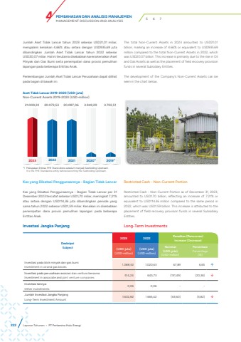 Jumlah Aset Tidak Lancar tahun 2023 sebesar USD21,01 miliar, mengalami kenaikan 4,66% atau setara dengan USD935,69 juta dibandingkan Jumlah Aset Tidak Lancar tahun 2022 sebesar USD20,07 miliar. Hal ini terutama disebabkan karena kenaikan Aset Minyak dan Gas Bumi serta penempatan dana provisi pemulihan lapangan pada beberapa Entitas Anak.Perkembangan Jumlah Aset Tidak Lancar Perusahaan dapat dilihat pada bagan di bawah ini.The total Non-Current Assets in 2023 amounted to USD21.01 billion, marking an increase of 4.66% or equivalent to USD935.69 million compared to the total Non-Current Assets in 2022, which was USD20.07 billion. This increase is primarily due to the rise in Oil and Gas Assets as well as the placement of field recovery provision funds in several Subsidiary Entities.The development of the Company%u2019s Non-Current Assets can be seen in the chart below. Aset Tidak Lancar 2019-2023 (USD-juta)Non-Current Assets 2019-2023 (USD-million)21.009,22 20.073,53 20.097,06 3.949,29 3.722,512023 2022 2021 2020*) 2019*)Kas yang Dibatasi Penggunaannya - Bagian Tidak LancarKas yang Dibatasi Penggunaannya - Bagian Tidak Lancar per 31 Desember 2023 tercatat sebesar USD1,70 miliar, meningkat 7,21% atau setara dengan USD114,36 juta dibandingkan periode yang sama tahun 2022 sebesar USD1,59 miliar. Kenaikan ini disebabkan penempatan dana provisi pemulihan lapangan pada beberapa Entitas Anak.Restricted Cash - Non-Current PortionRestricted Cash - Non-Current Portion as of December 31, 2023, amounted to USD1.70 billion, reflecting an increase of 7.21% or equivalent to USD114.36 million compared to the same period in 2022, which was USD1.59 billion. This increase is attributed to the placement of field recovery provision funds in several Subsidiary Entities.DeskripsiSubject2023 2022 Kenaikan (Penurunan)Increase (Decrease)(USD-juta)(USD-million)(USD-juta)(USD-million)Nominal(USD-juta)(USD-million)PersentasePercentage(%)Investasi pada blok minyak dan gas bumiInvestment in oil and gas blocks 1.088,52 1.020,63 67,89 6,65 %uf0e1Investasi pada perusahaan asosiasi dan ventura bersamaInvestment in associate and joint venture companies 514,24 645,73 (131,49) (20,36) %uf0e2Investasi lainnyaOther investments 0,06 0,06 - - Jumlah Investasi Jangka PanjangLong-Term Investment Amount 1.602,82 1.666,42 (63,60) (3,82) %uf0e2Investasi Jangka Panjang Long-Term Investments*) Merupakan Entitas PHE Stand Alone sebelum menjadi Subholding Upstream.It is the PHE Standalone entity before becoming the Subholding Upstream.222 Laporan Tahunan %u2022 PT Pertamina Hulu EnergiPEMBAHASAN DAN ANALISIS MANAJEMENMANAGEMENT DISCUSSION AND ANALYSIS 4 5 6 7