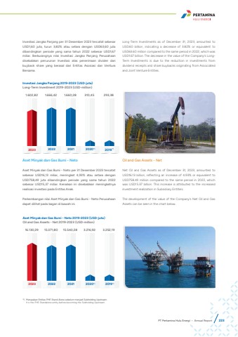 Investasi Jangka Panjang 2019-2023 (USD-juta)Long-Term Investment 2019-2023 (USD-million)1.602,82 1.666,42 1.660,28 310,45 293,382023 2022 2021 2020*) 2019*)Aset Minyak dan Gas Bumi - NetoAset Minyak dan Gas Bumi - Neto per 31 Desember 2023 tercatat sebesar USD16,13 miliar, meningkat 4,93% atau setara dengan USD758,49 juta dibandingkan periode yang sama tahun 2022 sebesar USD15,37 miliar. Kenaikan ini disebabkan meningkatnya realisasi investasi pada Entitas Anak.Perkembangan nilai Aset Minyak dan Gas Bumi - Neto Perusahaan dapat dilihat pada bagan di bawah ini.Oil and Gas Assets - NetNet Oil and Gas Assets as of December 31, 2023, amounted to USD16.13 billion, reflecting an increase of 4.93% or equivalent to USD758.49 million compared to the same period in 2022, which was USD15.37 billion. This increase is attributed to the increased investment realization in Subsidiary Entities.The development of the value of the Company%u2019s Net Oil and Gas Assets can be seen in the chart below.Investasi Jangka Panjang per 31 Desember 2023 tercatat sebesar USD1,60 juta, turun 3,82% atau setara dengan USD63,60 juta dibandingkan periode yang sama tahun 2022 sebesar USD1,67 miliar. Berkurangnya nilai Investasi Jangka Panjang Perusahaan disebabkan penurunan Investasi atas penerimaan dividen dan buyback share yang berasal dari Entitas Asosiasi dan Ventura Bersama.Long-Term Investments as of December 31, 2023, amounted to USD.60 billion, indicating a decrease of 3.82% or equivalent to USD63.60 million compared to the same period in 2022, which was USD1.67 billion. The decrease in the value of the Company%u2019s LongTerm Investments is due to the reduction in investments from dividend receipts and share buybacks originating from Associated and Joint Venture Entities.Aset Minyak dan Gas Bumi - Neto 2019-2023 (USD-juta)Oil and Gas Assets - Net 2019-2023 (USD-million)16.130,29 15.371,80 15.540,28 3.216,92 3.252,192023 2022 2021 2020*) 2019*)*) Merupakan Entitas PHE Stand Alone sebelum menjadi Subholding Upstream.It is the PHE Standalone entity before becoming the Subholding Upstream.PT Pertamina Hulu Energi %u2022 Annual Report 223