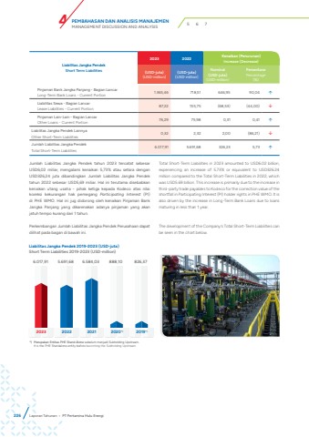 Liabilitas Jangka PendekShort Term Liabilities2023 2022 Kenaikan (Penurunan)Increase (Decrease)(USD-juta)(USD-million)(USD-juta)(USD-million)Nominal (USD-juta)(USD-million)PersentasePercentage(%)Pinjaman Bank Jangka Panjang - Bagian LancarLong-Term Bank Loans - Current Portion 1.365,46 718,51 646,95 90,04 %uf0e1Liabilitas Sewa - Bagian LancarLease Liabilities - Current Portion 87,22 155,75 (68,53) (44,00) %uf0e2Pinjaman Lain-Lain - Bagian LancarOther Loans - Current Portion 76,29 75,98 0,31 0,41 %uf0e1Liabilitas Jangka Pendek LainnyaOther Short-Term Liabilities 0,32 2,32 2,00 (86,21) %uf0e2Jumlah Liabilitas Jangka PendekTotal Short-Term Liabilities 6.017,91 5.691,68 326,23 5,73 %uf0e1Jumlah Liabilitas Jangka Pendek tahun 2023 tercatat sebesar USD6,02 miliar, mengalami kenaikan 5,73% atau setara dengan USD326,24 juta dibandingkan Jumlah Liabilitas Jangka Pendek tahun 2022 sebesar USD5,69 miliar. Hal ini terutama disebabkan kenaikan utang usaha - pihak ketiga kepada Kodeco atas nilai koreksi kekurangan hak pemegang Participating Interest (PI) di PHE WMO. Hal ini jug didorong oleh kenaikan Pinjaman Bank Jangka Panjang yang dikarenakan adanya pinjaman yang akan jatuh tempo kurang dari 1 tahun.Perkembangan Jumlah Liabilitas Jangka Pendek Perusahaan dapat dilihat pada bagan di bawah ini.Total Short-Term Liabilities in 2023 amounted to USD6.02 billion, experiencing an increase of 5.73% or equivalent to USD326.24 million compared to the Total Short-Term Liabilities in 2022, which was USD5.69 billion. This increase is primarily due to the increase in third-party trade payables to Kodeco for the correction value of the shortfall in Participating Interest (PI) holder rights in PHE WMO. It is also driven by the increase in Long-Term Bank Loans due to loans maturing in less than 1 year.The development of the Company%u2019s Total Short-Term Liabilities can be seen in the chart below.Liabilitas Jangka Pendek 2019-2023 (USD-juta)Short Term Liabilities 2019-2023 (USD-million)6.017,91 5.691,68 6.584,03 888,10 826,372023 2022 2021 2020*) 2019*)*) Merupakan Entitas PHE Stand Alone sebelum menjadi Subholding Upstream.It is the PHE Standalone entity before becoming the Subholding Upstream.226 Laporan Tahunan %u2022 PT Pertamina Hulu EnergiPEMBAHASAN DAN ANALISIS MANAJEMENMANAGEMENT DISCUSSION AND ANALYSIS 4 5 6 7