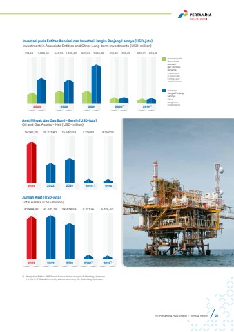 PT Pertamina Hulu Energi %u2022 Annual Report 21*) Merupakan Entitas PHE Stand Alone sebelum menjadi Subholding Upstream.It is the PHE Standalone entity before becoming the Subholding Upstream.Investasi pada Entitas Asosiasi dan Investasi Jangka Panjang Lainnya (USD-juta) Investment in Associate Entities and Other Long-term Investments (USD-million)514,24 1,088,58 645,73 1.020,69 609,06 1.660,28 310,38 310,45 293,31 293,382023 2022 2021 2020*) 2019*)Investasi pada Perusahaan Asosiasi dan Ventura BersamaInvestment in Associate Entities and Joint VentureInvestasi Jangka Panjang LainnyaOther Long-term InvestmentsAset Minyak dan Gas Bumi - Bersih (USD-juta)Oil and Gas Assets - Net (USD-million)16.130,29 15.371,80 15.540,28 3.216,92 3.252,19 2023 2022 2021 2020*) 2019*)Jumlah Aset (USD-juta)Total Assets (USD-million)30.888,92 31.481,79 28.478,59 5.321,36 5.126,40 2023 2022 2021 2020*) 2019*)