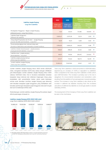 Liabilitas Jangka PanjangLong-Term Liabilities2023 2022Kenaikan (Penurunan)Increase (Decrease)(USD-juta)(USD-million)(USD-juta)(USD-million)Nominal (USD-juta)(USD-million)PersentasePercentage(%)Pendapatan Tangguhan - Bagian Jangka PanjangDeferred Income - Long-Term Portion 7,02 20,40 (13,38) (65,59) %uf0e2Liabilitas Pajak TangguhanDeferred Tax Liabilities 2.625,37 2.573,18 52,19 2,03 %uf0e1Utang Pajak Penghasilan dan Dividen - Jangka PanjangIncome Tax Debt and Dividends - Long Term 16,09 16,01 0,08 0,50 %uf0e1Provisi pembongkaran dan restorasi lokasi asetProvision of demolition and restoration of asset locations 3.784,92 3.460,33 324,59 9,38 %uf0e1Liabilitas imbalan kerja karyawan - jangka panjangEmployee benefit liabilities- long-term 318,60 298,26 20,34 6,82 %uf0e1Liabilitas sewa - jangka panjangRental liabilities - long-term 85,97 151,94 (65,97) (43,42) %uf0e2Liabilitas jangka panjang lainnyaOther long-term liabilities 273,77 113,04 160,73 142,19 %uf0e1Jumlah Liabilitas Jangka PanjangTotal Long-Term Liabilities 10.692,45 10.631,84 60,61 0,57 %uf0e1Jumlah Liabilitas Jangka Panjang tahun 2023 senilai USD10,69 miliar, mengalami kenaikan 0,57% atau setara dengan USD60,61 juta dibandingkan Jumlah Liabilitas Jangka Panjang tahun 2022 sebesar USD10,63 miliar. Hal ini terutama disebabkan kenaikan kewajiban biaya restorasi dan reklamasi lingkungan hidup yang disebabkan oleh penambahan beban akresi pada beberapa entitas anak. Kenaikan LIanilitas Jangka Panjang juga didorong oleh kenaikan kewajiban pajak tangguhan yang disebabkan oleh kenaikan perhitungan kewajiban pajak tangguhan atas aset minyak dan bumi di beberapa entitas anak.Perkembangan Jumlah Liabilitas Jangka Panjang Perusahaan dapat dilihat pada bagan di bawah ini.Total Long-Term Liabilities in 2023 amounted to USD10.69 billion, experiencing an increase of 0.57% or equivalent to USD60.61 million compared to the Total Long-Term Liabilities in 2022, which was USD10.63 billion. This increase is primarily due to the rise in obligations for environmental restoration and reclamation costs resulting from the addition of accrual expenses in several subsidiary entities. The increase in Long-Term Liabilities is also driven by the increase in deferred tax liabilities resulting from the increased calculation of deferred tax liabilities on oil and gas assets in several subsidiary entities.The development of the Company%u2019s Total Long-Term Liabilities can be seen in the chart below.Liabilitas Jangka Panjang 2019-2023 (USD-juta)Long-Term Liabilities 2019-2023 (USD-million)10.692,45 10.631,84 8.502,97 1.659,54 1.468,072023 2022 2021 2020*) 2019*)*) Merupakan Entitas PHE Stand Alone sebelum menjadi Subholding Upstream.It is the PHE Standalone entity before becoming the Subholding Upstream.228 Laporan Tahunan %u2022 PT Pertamina Hulu EnergiPEMBAHASAN DAN ANALISIS MANAJEMENMANAGEMENT DISCUSSION AND ANALYSIS 4 5 6 7