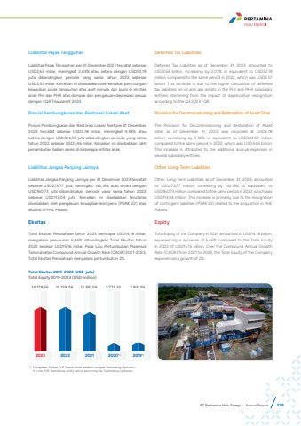 Liabilitas Pajak TangguhanLiabilitas Pajak Tangguhan per 31 Desember 2023 tercatat sebesar USD2,63 miliar, meningkat 2,03% atau setara dengan USD52,19 juta dibandingkan periode yang sama tahun 2022 sebesar USD2,57 miliar. Kenaikan ini disebabkan oleh kenaikan perhitungan kewajiban pajak tangguhan atas aset minyak dan bumi di entitas anak PHI dan PHR atas dampak dari pengakuan depresiasi sesuai dengan FQR Triwulan III 2023.Provisi Pembongkaran dan Restorasi Lokasi AsetProvisi Pembongkaran dan Restorasi Lokasi Aset per 31 Desember 2023 tercatat sebesar USD3,78 miliar, meningkat 9,38% atau setara dengan USD324,59 juta dibandingkan periode yang sama tahun 2022 sebesar USD3,46 miliar. Kenaikan ini disebabkan oleh penambahan beban akresi di beberapa entitas anak.Liabilitas Jangka Panjang LainnyaLiabilitas Jangka Panjang Lainnya per 31 Desember 2023 tercatat sebesar USD273,77 juta, meningkat 142,19% atau setara dengan USD160,73 juta dibandingkan periode yang sama tahun 2022 sebesar USD113,04 juta. Kenaikan ini disebabkan terutama disebabkan oleh pengakuan kewajiban kontijensi (PSAK 22) atas akuisisi di PHE Masela.EkuitasTotal Ekuitas Perusahaan tahun 2023 mencapai USD14,18 miliar, mengalami penurunan 6,46% dibandingkan Total Ekuitas tahun 2022 sebesar USD15,16 miliar. Pada Laju Pertumbuhan Majemuk Tahunan atau Compound Annual Growth Rate (CAGR) 2021-2023, Total Ekuitas Perusahaan mengalami pertumbuhan 2%.Deferred Tax LiabilitiesDeferred Tax Liabilities as of December 31, 2023, amounted to USD2.63 billion, increasing by 2.03% or equivalent to USD52.19 million compared to the same period in 2022, which was USD2.57 billion. This increase is due to the higher calculation of deferred tax liabilities on oil and gas assets in the PHI and PHR subsidiary entities, stemming from the impact of depreciation recognition according to the Q3 2023 FQR.Provision for Decommissioning and Restoration of Asset SitesThe Provision for Decommissioning and Restoration of Asset Sites as of December 31, 2023, was recorded at USD3.78 billion, increasing by 9.38% or equivalent to USD324.59 million compared to the same period in 2022, which was USD3.46 billion.This increase is attributed to the additional accrual expenses in several subsidiary entities.Other Long-Term LiabilitiesOther Long-Term Liabilities as of December 31, 2023, amounted to USD273.77 million, increasing by 142.19% or equivalent to USD160.73 million compared to the same period in 2022, which was USD113.04 million. This increase is primarily due to the recognition of contingent liabilities (PSAK 22) related to the acquisition in PHE Masela.EquityTotal Equity of the Company in 2023 amounted to USD14.18 billion, experiencing a decrease of 6.46% compared to the Total Equity in 2022 of USD15.16 billion. Over the Compound Annual Growth Rate (CAGR) from 2021 to 2023, the Total Equity of the Company experienced a growth of 2%.Total Ekuitas 2019-2023 (USD-juta)Total Equity 2019-2023 (USD-million)14.178,56 15.158,28 13.391,59 2.773,33 2.831,952023 2022 2021 2020*) 2019*)*) Merupakan Entitas PHE Stand Alone sebelum menjadi Subholding Upstream.It is the PHE Standalone entity before becoming the Subholding Upstream.PT Pertamina Hulu Energi %u2022 Annual Report 229