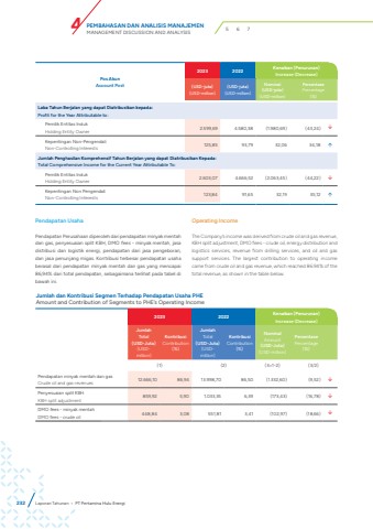 Pos AkunAccount Post2023 2022 Kenaikan (Penurunan)Increase (Decrease)(USD-juta)(USD-million)(USD-juta)(USD-million)Nominal (USD-juta)(USD-million)PersentasePercentage(%)Laba Tahun Berjalan yang dapat Diatribusikan kepada:Profit for the Year Attributable to:Pemilik Entitas IndukHolding Entity Owner 2.599,69 4.580,38 (1.980,69) (43,24) %uf0e2Kepentingan Non-PengendaliNon-Controlling Interests 125,85 93,79 32,06 34,18 %uf0e1Jumlah Penghasilan Komprehensif Tahun Berjalan yang dapat Diatribusikan Kepada:Total Comprehensive Income for the Current Year Attributable To:Pemilik Entitas IndukHolding Entity Owner 2.603,07 4.666,52 (2.063,45) (44,22) %uf0e2Kepentingan Non PengendaliNon-Controlling Interests 123,84 91,65 32,19 35,12 %uf0e1Pendapatan UsahaPendapatan Perusahaan diperoleh dari pendapatan minyak mentah dan gas, penyesuaian split KBH, DMO fees - minyak mentah, jasa distribusi dan logistik energi, pendapatan dari jasa pengeboran, dan jasa penunjang migas. Kontribusi terbesar pendapatan usaha berasal dari pendapatan minyak mentah dan gas yang mencapai 86,94% dari total pendapatan, sebagaimana terlihat pada tabel di bawah ini.Operating IncomeThe Company%u2019s income was derived from crude oil and gas revenue, KBH split adjustment, DMO fees - crude oil, energy distribution and logistics services, revenue from drilling services, and oil and gas support services. The largest contribution to operating income came from crude oil and gas revenue, which reached 86.94% of the total revenue, as shown in the table below.Jumlah dan Kontribusi Segmen Terhadap Pendapatan Usaha PHEAmount and Contribution of Segments to PHE%u2019s Operating Income2023 2022 Kenaikan (Penurunan)Increase (Decrease)JumlahTotal(USD-Juta)(USDmillion)KontribusiContribution(%)JumlahTotal(USD-Juta)(USDmillion)KontribusiContribution(%)NominalAmount (USD-Juta)(USD-million)PersentasePercentage(%)(1) (2) (3=1-2) (3/2)Pendapatan minyak mentah dan gas Crude oil and gas revenues 12.666,10 86,94 13.998,70 86,50 (1.332,60) (9,52) %uf0e2Penyesuaian split KBHKBH split adjustment 859,92 5,90 1.033,35 6,39 (173,43) (16,78) %uf0e2DMO fees - minyak mentahDMO fees - crude oil 448,84 3,08 551,81 3,41 (102,97) (18,66) %uf0e2232 Laporan Tahunan %u2022 PT Pertamina Hulu EnergiPEMBAHASAN DAN ANALISIS MANAJEMENMANAGEMENT DISCUSSION AND ANALYSIS 4 5 6 7
