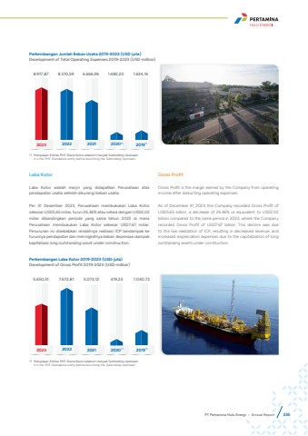 Perkembangan Jumlah Beban Usaha 2019-2023 (USD-juta)Development of Total Operating Expenses 2019-2023 (USD-million)8.917,87 8.510,59 6.666,96 1.482,20 1.634,162023 2022 2021 2020*) 2019*)Laba KotorLaba Kotor adalah marjin yang didapatkan Perusahaan atas pendapatan usaha setelah dikurangi beban usaha.Per 31 Desember 2023, Perusahaan membukukan Laba Kotor sebesar USD5,65 miliar, turun 26,36% atau setara dengan USD2,02 miliar dibandingkan periode yang sama tahun 2022 di mana Perusahaan membukukan Laba Kotor sebesar USD7,67 miliar. Penurunan ini disebabkan rendahnya realisasi ICP berdampak ke turunnya pendapatan dan meningkatnya beban depresiasi dampak kapitalisasi long outstanding asset under construction.Gross ProfitGross Profit is the margin earned by the Company from operating income after deducting operating expenses.As of December 31, 2023, the Company recorded Gross Profit of USD5.65 billion, a decrease of 26.36% or equivalent to USD2.02 billion compared to the same period in 2022, where the Company recorded Gross Profit of USD7.67 billion. This decline was due to the low realization of ICP, resulting in decreased revenue, and increased depreciation expenses due to the capitalization of long outstanding assets under construction.Perkembangan Laba Kotor 2019-2023 (USD-juta)Development of Gross Profit 2019-2023 (USD-million)5.650,51 7.672,81 5.073,12 419,23 1.040,722023 2022 2021 2020*) 2019*)*) Merupakan Entitas PHE Stand Alone sebelum menjadi Subholding Upstream.It is the PHE Standalone entity before becoming the Subholding Upstream.*) Merupakan Entitas PHE Stand Alone sebelum menjadi Subholding Upstream.It is the PHE Standalone entity before becoming the Subholding Upstream.PT Pertamina Hulu Energi %u2022 Annual Report 235