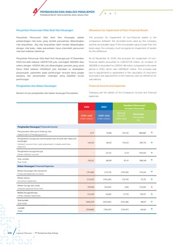 2023 2022 Kenaikan (Penurunan)Increase (Decrease)(USD-Juta)(USD-million)(USD-Juta)(USD-million)NominalAmount (USD-Juta)PersentasePercentage(%)Penghasilan Keuangan/ Financial IncomePenyesuaian atas porsi lindung nilaiAdjustment of hedging portion 0,17 12,89 (12,72) (98,68) %uf0e2Penghasilan bunga dari penempatan kas di bank dan deposito berjangkaInterest income from cash placement in banks and time deposits140,23 36,22 104,01 287,16 %uf0e1Penghasilan bunga lainnyaOther interest income - (0,12) 0,12 100,00 %uf0e1Sub JumlahSub-total 140,41 48,99 91,41 186,58 %uf0e1Beban Keuangan/ Financial ExpensesBeban keuangan dari pinjamanFinancial expenses on loans (311,68) (113,73) (197,95) 174,05 %uf0e1Beban akresiAccretion expenses (113,22) (100,46) (12,76) 12,70 %uf0e1Beban bunga dari sewaInterest expense from rent (19,99) (23,05) 3,06 (13,29) %uf0e2Beban bunga lainnyaOther interest expenses (14,39) (6,66) (7,73) 116,07 %uf0e1SubJumlahSub-total (459,29) (243,90) (215,38) 88,31 %uf0e1JumlahTotal (318,88) (194,91) (123,97) 63,60 %uf0e1Penyisihan Penurunan Nilai Aset Non KeuanganPenyisihan Penurunan Nilai Aset Non Keuangan adalah perbandingan nilai buku yang dicatat perusahaan dibandingkan nilai terpulihkan. Jika nilai terpulihkan lebih rendah dibandingkan dengan nilai buku, maka perusahaan harus mencatat penurunan nilai aset sebesar selisihnya.Penyisihan Penurunan Nilai Aset Non Keuangan per 31 Desember 2023 tercatat sebesar USD707,09 juta, meningkat 326,96% atau setara dengan USD541,48 juta dibandingkan periode yang sama tahun 2022 sebesar USD165,61 juta. Kenaikan ini disebabkan penyesuaian parameter pada perhitungan rencana kerja jangka panjang, dan penyesuaian cadangan yang dijadikan acuan perhitungan.Penghasilan dan Beban KeuanganBerikut rincian penghasilan dan beban keuangan Perusahaan.Allowance for Impairment of Non-Financial AssetsThe provision for impairment of non-financial assets is the comparison between the recorded book value by the company and the recoverable value. If the recoverable value is lower than the book value, the company must recognize an impairment of assets for the difference.As of December 31, 2023, the provision for impairment of nonfinancial assets amounted to USD707.09 million, an increase of 326.96% or equivalent to USD541.48 million compared to the same period in 2022, which was USD165.61 million. This increase was due to adjustments in parameters in the calculation of long-term work plans and adjustments to the reserves used as reference for calculations.Financial Income and ExpensesFollowing are the details of the Company%u2019s income and financial expenses.236 Laporan Tahunan %u2022 PT Pertamina Hulu EnergiPEMBAHASAN DAN ANALISIS MANAJEMENMANAGEMENT DISCUSSION AND ANALYSIS 4 5 6 7