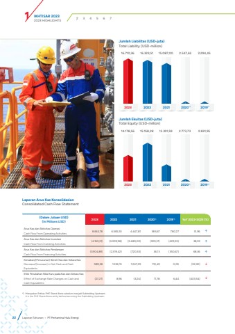 IKHTISAR 2023 1 2023 HIGHLIGHTS 2 3 4 5 6 722 Laporan Tahunan %u2022 PT Pertamina Hulu Energi(Dalam Jutaan USD)(In Millions USD) 2023 2022 2021 2020*) 2019*) YoY 2022-2023 (%)Arus Kas dari Aktivitas OperasiCash Flow From Operating Activities 8.663,78 6.565,53 4.447,81 383,67 780,27 31,96 %uf0e1Arus Kas dari Aktivitas InvestasiCash Flow From Investing Activities (4.169,31) (3.009,98) (2.480,00) (309,31) (429,55) 38,52 %uf0e1Arus Kas dari Aktivitas PendanaanCash Flow From Financing Activities (3.904,89) (2.319,42) (720,53) 36,13 (350,67) 68,36 %uf0e1Kenaikan/(Penurunan) Bersih Kas dan Setara KasDecrease/(Increase) in Net Cash and Cash Equivalents 589,58 1.236,13 1.247,29 110,49 0,05 (52,30) %uf0e2Efek Perubahan Nilai Kurs pada Kas dan Setara KasEffect of Exchange Rate Changes on Cash and Cash Equivalents (27,21) 8,96 (3,24) 11,78 6,44 (403,54) %uf0e2Jumlah Liabilitas (USD-juta)Total Liability (USD-million)16.710,36 16.323,51 15.087,00 2.547,63 2.294,45 2023 2022 2021 2020*) 2019*)Jumlah Ekuitas (USD-juta)Total Equity (USD-million)14.178,56 15.158,28 13.391,59 2.773,73 2.831,95 2023 2022 2021 2020*) 2019*)Laporan Arus Kas KonsolidasianConsolidated Cash Flow Statement*) Merupakan Entitas PHE Stand Alone sebelum menjadi Subholding Upstream.It is the PHE Stand Alone entity before becoming the Subholding Upstream.