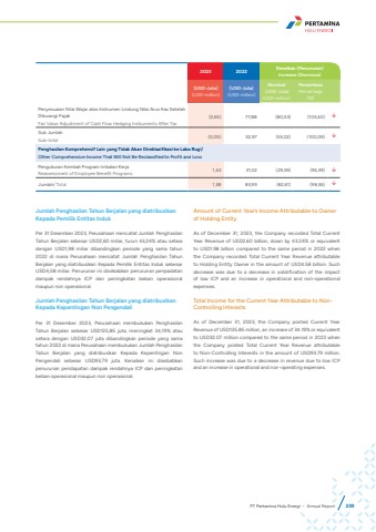 Jumlah Penghasilan Tahun Berjalan yang diatribusikan Kepada Pemilik Entitas IndukPer 31 Desember 2023, Perusahaan mencatat Jumlah Penghasilan Tahun Berjalan sebesar USD2,60 miliar, turun 43,24% atau setara dengan USD1,98 miliar dibandingkan periode yang sama tahun 2022 di mana Perusahaan mencatat Jumlah Penghasilan Tahun Berjalan yang diatribusikan Kepada Pemilik Entitas Induk sebesar USD4,58 miliar. Penurunan ini disebabkan penurunan penpadatan dampak rendahnya ICP dan peningkatan beban operasional maupun non operasional.Jumlah Penghasilan Tahun Berjalan yang diatribusikan Kepada Kepentingan Non PengendaliPer 31 Desember 2023, Perusahaan membukukan Penghasilan Tahun Berjalan sebesar USD125,85 juta, meningkat 34,19% atau setara dengan USD32,07 juta dibandingkan periode yang sama tahun 2022 di mana Perusahaan membukukan Jumlah Penghasilan Tahun Berjalan yang diatribusikan Kepada Kepentingan Non Pengendali sebesar USD93,79 juta. Kenaikan ini disebabkan penurunan pendapatan dampak rendahnya ICP dan peningkatan beban operasional maupun non operasional.Amount of Current Year%u2019s Income Attributable to Owner of Holding EntityAs of December 31, 2023, the Company recorded Total Current Year Revenue of USD2.60 billion, down by 43.24% or equivalent to USD1.98 billion compared to the same period in 2022 when the Company recorded Total Current Year Revenue attributable to Holding Entity Owner in the amount of USD4.58 billion. Such decrease was due to a decrease in solidification of the impact of low ICP and an increase in operational and non-operational expenses.Total Income for the Current Year Attributable to NonControlling InterestsAs of December 31, 2023, the Company posted Current Year Revenue of USD125.85 million, an increase of 34.19% or equivalent to USD32.07 million compared to the same period in 2022 when the Company posted Total Current Year Revenue attributable to Non-Controlling Interests in the amount of USD93.79 million. Such increase was due to a decrease in revenue due to low ICP and an increase in operational and non-operating expenses.2023 2022 Kenaikan (Penurunan)Increase (Decrease)(USD-Juta)(USD-million)(USD-Juta)(USD-million)Nominal (USD-Juta)(USD-million)PersentasePercentage(%)Penyesuaian Nilai Wajar atas Instrumen Lindung Nilai Arus Kas Setelah Dikurangi PajakFair Value Adjustment of Cash Flow Hedging Instruments After Tax (2,65) 77,88 (80,53) (103,40) %uf0e2Sub JumlahSub-total (0,05) 52,97 (53,02) (100,09) %uf0e2Penghasilan Komprehensif Lain yang Tidak Akan Direklasifikasi ke Laba Rugi/ Other Comprehensive Income That Will Not Be Reclassified to Profit and LossPengukuran Kembali Program Imbalan KerjaReassessment of Employee Benefit Programs 1,43 31,02 (29,59) (95,39) %uf0e2Jumlah/ Total 1,38 83,99 (82,61) (98,36) %uf0e2PT Pertamina Hulu Energi %u2022 Annual Report 239