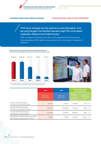 LAPORAN ARUS KAS KONSOLIDASIAN CONSOLIDATED CASH FLOW STATEMENT%u201cPHE terus menjaga arus kas pada level yang diharapkan. Arus kas yang tangguh memberikan kekuatan bagi PHE untuk dapat melakukan ekspansi bisnis lebih leluasa.%u201d%u201cPHE continues to maintain cash flow at the expected level. Strong cash flow strengthens PHE%u2019s ability and provides it with more space to expand its business.%u201dKas dan Setara Kas pada Akhir Tahun 2019-2023 (USD-juta)Cash and Cash Equivalents at the End of 2019-2023 (USD-million)5.018,74 4.456 ,36 3.211 ,27 346,01 223,742023 2022 2021 2020*) 2019*)2023 2022 Kenaikan (Penurunan)Increase (Decrease)(USD-Juta)(USD-million)(USD-Juta)(USD-million)NominalAmount (USD-Juta)(USD-million)PersentasePercentage(%)Arus Kas dari Aktivitas OperasiCash Flow from Operating Activities 8.663,78 6.565,53 2.098,25 31,96 %uf0e1Arus Kas dari Aktivitas InvestasiCash Flow from Investment Activities (4.169,31) (3.009,98) (1.159,33) 38,52 %uf0e1Arus Kas dari Aktivitas PendanaanCash Flow from Funding Activities (3.904,89) (2.319,42) (1.585,47) 68,36 %uf0e1Kenaikan/Penurunan Bersih Kas dan Setara KasNet Increase in Cash and Cash Equivalents 589,58 1.236,13 (646,55) (52,30) %uf0e2*) Merupakan Entitas PHE Stand Alone sebelum menjadi Subholding Upstream.It is the PHE Standalone entity before becoming the Subholding Upstream.240 Laporan Tahunan %u2022 PT Pertamina Hulu EnergiPEMBAHASAN DAN ANALISIS MANAJEMENMANAGEMENT DISCUSSION AND ANALYSIS 4 5 6 7