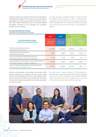 Kas Bersih yang diperoleh dari Aktivitas Operasi tahun 2023 sebesar USD8.664 juta meningkat 32% atau setara dengan USD2.098 juta dibandingkan Kas Bersih yang Diperoleh dari Aktivitas Operasi tahun 2022 sebesar USD6.566 juta. Hal ini terutama disebabkan peningkatan penerimaan kas dari pelanggan dan pergerakan pembayaran kas ke pemasok.Net Cash Provided by Operating Activities in 2023 amounted to USD8.664 million, increasing by 32% or USD2.098 million compared to the Net Cash Provided by Operating Activities in 2022 of USD6.566 million. This increase was primarily due to higher cash receipts from customers and changes in cash payments to suppliers.Arus Kas dari Aktivitas InvestasiCash Flow from Investment Activities2023 2022 Kenaikan (Penurunan)Increase (Decrease)(USD-Juta)(USD-million)(USD-Juta)(USD-million)NominalAmount (USD-Juta)(USD-million)PersentasePercentage(%)Pembelian Aset Minyak dan Gas BumiPurchase of Oil and Gas Assets (3.948,08) (3.002,25) (945,83) 31,50 %uf0e1Kas yang Dibayar Untuk Aset TetapCash Paid For Fixed Assets (79,96) (48,52) (31,44) 64,80 %uf0e1Penerimaan Kas Terkait Investasi Pada Entitas AnakCash Receipts Related to Investment in Subsidiaries 152,35 125,69 26,66 21,21 %uf0e1Kas yang Dibayar Untuk Penambahan Investasi Pada Entitas AnakCash Paid for Additional Investment in Subsidiaries (293,62) (84,90) (208,72) 245,84 %uf0e1Kas bersih diperoleh dari/digunakan untuk aktivitas investasiNet Cash Used for Investment Activities (4.169,31) (3.009,98) (1.159,33) 38,52 %uf0e1Arus Kas dari Aktivitas InvestasiCash Flow from Investment ActivitiesKas Bersih yang digunakan untuk Aktivitas Investasi tahun 2023 sebesar USD4.169 juta, meningkat 39% atau setara dengan USD1.159 juta dibandingkan Kas Bersih yang Digunakan untuk Aktivitas Investasi tahun 2022 sebesar USD3,010 juta. Peningkatan tersebut karena sejalan dengan kegiatan investasi dan peningkatan aset tetap dan migas.Net Cash Used in Investing Activities in 2023 amounted to USD4,169 million, increasing by 39% or USD1,159 million compared to the Net Cash Used in Investing Activities in 2022 of USD3,010 million. This increase was due to the alignment with investment activities and the increase in fixed assets and oil and gas.242 Laporan Tahunan %u2022 PT Pertamina Hulu EnergiPEMBAHASAN DAN ANALISIS MANAJEMENMANAGEMENT DISCUSSION AND ANALYSIS 4 5 6 7