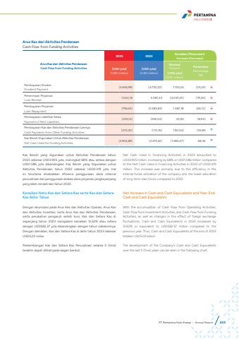 Arus Kas dari Aktivitas PendanaanCash Flow from Funding Activities2023 2022 Kenaikan (Penurunan)Increase (Decrease)(USD-juta)(USD-million)(USD-juta)(USD-million)NominalAmount(USD-juta)(USD-million)PersentasePercentage(%)Pembayaran DividenDividend Payment (3.646,98) (4.750,22) 1.103,24 (23,23) %uf0e2Penerimaan PinjamanLoan Receipt 1.044,18 5.081,43 (4.037,25) (79,45) %uf0e2Pembayaran PinjamanLoan Repayment (796,65) (2.283,83) 1.487,18 (65,12) %uf0e2Pembayaran Liabilitas Sewa Payment of Rent Liabilities (233,14) (256,04) 22,90 (8,94) %uf0e2Pembayaran Kas dari Aktivitas Pendanaan LainnyaCash Payments from Other Funding Activities (272,30) (110,76) (161,54) 145,85 %uf0e1Kas Bersih Digunakan Untuk Aktivitas PendanaanNet Cash Used for Funding Activities (3.904,89) (2.319,42) (1.585,47) 68,36 %uf0e1Arus Kas dari Aktivitas PendanaanCash Flow from Funding ActivitiesKas Bersih yang digunakan untuk Aktivitas Pendanaan tahun 2023 sebesar USD3.905 juta, meningkat 68% atau setara dengan USD1.586 juta dibandingkan Kas Bersih yang Digunakan untuk Aktivitas Pendanaan tahun 2022 sebesar USD2.319 juta. Hal ini terutama disebabkan efisiensi penggunaan dana internal perusahaan dan penggunaan alokasi dana pinjaman jangka panjang yang lebih rendah dari tahun 2022.Kenaikan Neto Kas dan Setara Kas serta Kas dan Setara Kas Akhir TahunDengan akumulasi pada Arus Kas dari Aktivitas Operasi, Arus Kas dari Aktivitas Investasi, serta Arus Kas dari Aktivitas Pendanaan, serta perubahan pengaruh selisih kurs, Kas dan Setara Kas di sepanjang tahun 2023 mengalami kenaikan 12,62% atau setara dengan USD562,37 juta dibandingkan dengan tahun sebelumnya. Dengan demikian, Kas dan Setara Kas di akhir tahun 2023 sebesar USD5,02 miliar.Perkembangan Kas dan Setara Kas Perusahaan selama 5 (lima) terakhir dapat dilihat pada bagan berikut.Net Cash Used in Financing Activities in 2023 amounted to USD3.905 million, increasing by 68% or USD1.586 million compared to the Net Cash Used in Financing Activities in 2022 of USD2.319 million. This increase was primarily due to the efficiency in the internal funds utilization of the company and the lower allocation of long-term loan funds compared to 2022.Net Increase in Cash and Cash Equivalents and Year-End Cash and Cash EquivalentsWith the accumulation of Cash Flow from Operating Activities, Cash Flow from Investment Activities, and Cash Flow from Funding Activities, as well as changes in the effect of foeign exchange fluctuations, Cash and Cash Equivalents in 2023 increased by 12.62% or equivalent to USD562.37 million compared to the previous year. Thus, Cash and Cash Equivalents at the end of 2023 totaled USD5.02 billion.The development of the Company%u2019s Cash and Cash Equivalents over the last 5 (five) years can be seen in the following chart.PT Pertamina Hulu Energi %u2022 Annual Report 243