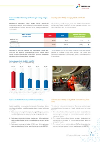 Rasio LikuiditasLiquidity Ratio 2023 2022 Kenaikan (Penurunan)Increase (Decrease)Rasio Kas (%)Cash Ratio (%) 83,40 78,30 5,10 %uf0e1Rasio Lancar (%)Current Ratio (%) 163,73 200,44 (36,71) %uf0e1Perkembangan Rasio Kas 2019-2023 (%)Cash Ratio Development 2019-2023 (%)83,40 78,30 49,01 41,03 41,792023 2022 2021 2020*) 2019*)Rasio Solvabilitas: Kemampuan Membayar UtangRasio solvabilitas menunjukkan kemampuan Perusahaan dalam membayar kewajiban-kewajibannya dan diukur melalui beberapa rasio, yaitu:1. Rasio utang berbunga terhadap aset yang dihitung dengan cara membandingkan jumlah utang berbunga dengan jumlah aset.2. Rasio utang berbunga terhadap ekuitas yang dihitung dengan cara membandingkan jumlah utang berbunga dengan jumlah ekuitas.3. Rasio utang berbunga terhadap EBITDA yang dihitung dengan cara membandingkan jumlah utang berbunga dengan EBITDA.Solvency Ratio: Ability to Pay Short-Term and Long-Term DebtThe solvency ratio demonstrates the Company%u2019s ability to pay its obligations and is measured through several ratios, namely as follows:1. The ratio of interest-bearing debt to assets is calculated by comparing the amount of interest-bearing debt with the number of assets.2. The ratio of interest-bearing debt to equity is calculated by comparing the amount of interest-bearing debt with the amount of equity.3. The ratio of interest-bearing debt to EBITDA is calculated by comparing the amount of interest-bearing debt with EBITDA.Peningkatan rasio kas dampak dari peningkatan jumlah kas, walaupun ada kenaikan pada kewajiban jangka pendek. Rasio lancar menurun dibandingkan tahun 2022 terutama disebabkan penurunan piutang yang sangat signifikan.The increase in the cash ratio is due to the rise in the cash balance, despite an increase in short-term liabilities. The current ratio decreased compared to 2022, primarily due to a significant decline in receivables.Rasio Likuiditas: Kemampuan Membayar Utang Jangka PendekKemampuan membayar utang jangka pendek Perusahaan dicerminkan dengan rasio likuiditas di mana tingkat likuiditas dapat dilihat dari rasio kas dan rasio lancar, sebagaimana terlihat di bawah ini. Liquidity Ratio: Ability to Repay Short-Term DebtThe Company%u2019s ability to repay short-term debt is reflected in the liquidity ratio where the level of liquidity is evident from the cash ratio and current ratio, as indicated below. *) Merupakan Entitas PHE Stand Alone sebelum menjadi Subholding Upstream.It is the PHE Standalone entity before becoming the Subholding Upstream.PT Pertamina Hulu Energi %u2022 Annual Report 245