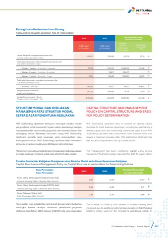 Piutang Usaha Berdasarkan Umur PiutangAccounts Receivable Based on Age of Receivables 2023 2022 Kenaikan (Penurunan)Increase (Decrease)(USD-Juta)(USD-million)(USD-Juta)(USD-million)NominalAmount (USD-Juta)(USD-million)PersentasePercentage(%)Lancar dan tidak mengalami penurunan nilaiCurrent and no decrease in value 1.654,72 1.206,96 447,76 37,10 %uf0e1Telah jatuh tempo dan tidak mengalami penurunan nilai:Due and no decrease in value:> 0 bulan - 3 bulan/ > 0 months - 3 months 172,32 2.125,57 (1.953,25) (91,89) %uf0e2> 3 bulan - 6 bulan/ > 3 months - 6 months - 766,17 (766,17) - %uf0e2> 6 bulan - 1 tahun/ > 6 months - 1 year 50,81 833,89 (783,08) (93,91) %uf0e2Telah jatuh tempo dan mengalami penurunan nilai:Due and decreased in value:> 365 hari/ > 365 days 982,90 169,77 813,12 478,95 %uf0e1Penyisihan penurunan nilaiImpairment allowance (92,35) (138,59) 46,24 (33,37) %uf0e2Jumlah Piutang Usaha - BersihTotal Accounts Receivable - Net 2.768,40 4.963,78 (2.195,38) (44,23) %uf0e2STRUKTUR MODAL DAN KEBIJAKAN MANAJEMEN ATAS STRUKTUR MODAL SERTA DASAR PENENTUAN KEBIJAKANCAPITAL STRUCTURE AND MANAGEMENT POLICY ON CAPITAL STRUCTURE AND BASIS FOR POLICY DETERMINATIONPHE Subholding Upstream bertujuan mencapai struktur modal yang optimal untuk memenuhi tujuan usaha, diantaranya dengan mempertahankan rasio modal yang sehat dan memaksimalkan nilai pemegang saham. Beberapa instrumen utang PHE Subholding Upstream memiliki rasio keuangan yang mensyaratkan rasio leverage maksimum. PHE Subholding Upstream telah memenuhi semua persyaratan modal yang ditetapkan oleh pihak luar.Manajemen memantau modal dengan menggunakan beberapa ukuran leverage keuangan, terutama untuk rasio utang terhadap ekuitas.PHE Subholding Upstream aims to achieve an optimal capital structure to meet business objectives, including by maintaining a healthy capital ratio and maximizing shareholder value. Some PHE Subholding Upstream debt instruments have financial ratios that require a maximum leverage ratio. PHE Subholding Upstream has met all capital requirements set by outside parties.The Management has been monitoring capital using several measures of financial leverage, especially for debt-to-equity ratios.Struktur Modal dan Kebijakan Manajemen atas Struktur Modal serta Dasar Penentuan KebijakanCapital Structure and Management Policy on Capital Structure as well as Basis for Determining PoliciesRasio PermodalanRasio Permodalan 2023 2022 Kenaikan (Penurunan)Increase (Decrease)Rasio Utang Berbunga terhadap Ekuitas (kali)Interest-bearing Debt to Equity Ratio (times) 0,37 0,34 0,03 %uf0e1Rasio Utang Berbunga terhadap EBITDA (kali)Interest-bearing Debt to EBITDA Ratio (times) 0,60 0,49 0,11 %uf0e1Rasio Cakupan Utang (kali)Debt Coverage Ratio (times) 7,66 4,30 3,36 %uf0e1Peningkatan rasio solvabilitas yang terkait dengan utang berbunga meningkat karena terdapat tambahan penerimaan pinjaman eksternal pada tahun 2023 sebesar USD940 juta yang digunakan The increase in solvency ratio related to interest-bearing debt increased due to additional external loan receipts in 2023 totaling USD940 million used for the Company%u2019s operational needs. In PT Pertamina Hulu Energi %u2022 Annual Report 247