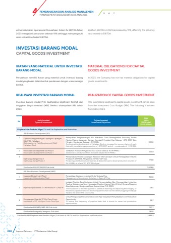 INVESTASI BARANG MODALCAPITAL GOODS INVESTMENTIKATAN YANG MATERIAL UNTUK INVESTASI BARANG MODALPerusahaan memiliki ikatan yang material untuk investasi barang modal yang bukan dalam bentuk pendanaan dengan uraian sebagai berikut.MATERIAL OBLIGATIONS FOR CAPITAL GOODS INVESTMENTIn 2023, the Company has not had material obligations for capital goods investments. REALISASI INVESTASI BARANG MODALInvestasi barang modal PHE Subholding Upstream terlihat dari Anggaran Biaya Investasi (ABI). Berikut disampaikan ABI tahun 2023.REALIZATION OF CAPITAL GOODS INVESTMENTPHE Subholding Upstream%u2019s capital goods investment can be seen from the Investment Cost Budget (ABI). The following is evident from ABI in 2023.No. Jenis InvestasiTypes of InvestmentTujuan InvestasiInvestment ObjectivesNilaiValue(USD-juta)(USD-million)Eksplorasi dan Produksi Migas/ Oil and Gas Exploration and ProductionABI Business Development (BD)1 Optimasi Pengembangan Lapangan-Lapangan (Opll) Wk MahakamOptimization of Field Development (Opll) Mahakam BlockMelanjutkan Pengembangan WK Mahakam Guna Meningkatkan Recovery FactorMasing-Masing Lapangan Dengan Kumulatif Produksi Gas Sebesar ~270 BSCF Dan Minyak + Kondensat Sebesar ~9 MMBBL.Continuing the development of Mahakam Block to increase the recovery factor of each field with cumulative gas production of ~270 BSCF and oil + condensate of ~9 MMBBL239,82 Rokan Well Development Slo Phase 1Rokan Well Development Slo Phase 1Tambahan Produksi Minyak Dari 303 Sumur Sebesar 35.19 MMBO.Additional oil production from 303 wells totaled 35.19 MMBO. 226,93Opll Sanga Sanga Fase 2Opll Sanga Sanga Phase 2Memproduksi Potensi Cadangan Reservoir Interval Dalam Untuk Mendapatkan Volume Produksi 9.4 MMBBL Minyak Dan 157 BCF WH Gas.Producing potential reservoir reserves at deep intervals to obtain production volumes of 9.4 MMBBL of oil and 157 BCF WH of gas.174,8SubJumlah ABI BD/ ABI BD Sub-total 2.928,8ABI Non-Business Development (NBD)1 Investasi Di Aset Lain (Piep)Investing in Other Assets (Piep)Pengelolaan Kegiatan Investasi Di Ap Terbuka PiepManagement of Investment Activities in Open AP Piep 132,82 Pipeline Replacement 12%u201d Mol Krisna P - Cinta 1PInstalasi Pipeline Baru Bertujuan Untuk Mengembalikan Dan Menggantikan Integritas Pipeline Sebelumnya Yang Merupakan Pipeline Utama (Main Oil Line) Dimana Plugging Atau Kebocoran Berdampak Pada Seluruh Area PHE OSES.The installation of the new pipeline is aimed at restoring and replacing the integrity of the previous pipeline which is the main pipeline (main oil line) where plugging or leakage impacts the entire PHE OSES area.48,43 Pemasangan Pipa Alir 12%u201d Mol Fpro-EcomInstallation of 12%u201d Mol Fpro-Ecom Flow PipeUntuk Mengurangi Frekuensi Kebocoran Pipa Yang Akan Menyebabkan Lost Production Opportunity.To reduce the frequency of pipeline leaks that is bound to cause lost production opportunities.38,7SubJumlah ABI NBD/ NBD ABI Sub-total 767,7SubJumlah Anorganik/ Inorganic Sub-total 186,8SubJumlah ABI Eksplorasi dan Produksi Migas/ Sub-total of ABI Oil and Gas Exploration and Production 3.883,3untuk kebutuhan operasional Perusahaan. Selain itu EBITDA tahun 2023 mengalami penurunan sebesar 19% sehingga mempengaruhi rasio solvabilitas terkait EBITDA.addition, EBITDA in 2023 decreased by 19%, affecting the solvency ratio related to EBITDA.248 Laporan Tahunan %u2022 PT Pertamina Hulu EnergiPEMBAHASAN DAN ANALISIS MANAJEMENMANAGEMENT DISCUSSION AND ANALYSIS 4 5 6 7