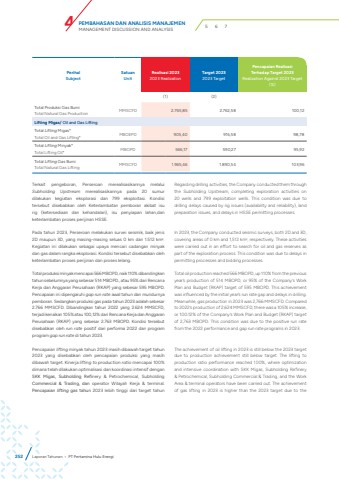 Terkait pengeboran, Perseroan merealisasikannya melalui Subholding Upstream merealisasikannya pada 20 sumur dilakukan kegiatan eksplorasi dan 799 eksploitasi. Kondisi tersebut disebabkan oleh Keterlambatan pemboran akibat isu rig (ketersediaan dan kehandalan), isu penyiapan lahan,dan keterlambatan proses perijinan HSSE.Pada tahun 2023, Perseroan melakukan survei seismik, baik jenis 2D maupun 3D, yang masing-masing seluas 0 km dan 1.512 km2. Kegiatan ini dilakukan sebagai upaya mencari cadangan minyak dan gas dalam rangka eksplorasi. Kondisi tersebut disebabkan oleh keterlambatan proses perijinan dan proses lelang.Total produksi minyak mencapai 566 MBOPD, naik 110% dibandingkan tahun sebelumnya yang sebesar 514 MBOPD., atau 95% dari Rencana Kerja dan Anggaran Perusahaan (RKAP) yang sebesar 595 MBOPD. Pencapaian ini dipengaruhi gap run rate awal tahun dan mundurnya pemboran. Sedangkan produksi gas pada tahun 2023 adalah sebesar 2.766 MMSCFD. Dibandingkan tahun 2022 yang 2.624 MMSCFD, terjadi kenaikan 105% atau 100,12% dari Rencana Kerja dan Anggaran Perusahaan (RKAP) yang sebesar 2.763 MBOPD. Kondisi tersebut disebabkan oleh run rate positif dari performa 2022 dan program program gap run rate di tahun 2023.Pencapaian lifting minyak tahun 2023 masih dibawah target tahun 2023 yang disebabkan oleh pencapaian produksi yang masih dibawah target. Kinerja lifting to production ratio mencapai 100% dimana telah dilakukan optimalisasi dan koordinasi intensif dengan SKK Migas, Subholding Refinery & Petrochemical, Subholding Commercial & Trading, dan operator Wilayah Kerja & terminal. Pencapaian lifting gas tahun 2023 lebih tinggi dari target tahun Regarding drilling activities, the Company conducted them through the Subholding Upstream, completing exploration activities on 20 wells and 799 exploitation wells. This condition was due to drilling delays caused by rig issues (availability and reliability), land preparation issues, and delays in HSSE permitting processes.In 2023, the Company conducted seismic surveys, both 2D and 3D, covering areas of 0 km and 1,512 km2, respectively. These activities were carried out in an effort to search for oil and gas reserves as part of the exploration process. This condition was due to delays in permitting processes and bidding processes.Total oil production reached 566 MBOPD, up 110% from the previous year%u2019s production of 514 MBOPD, or 95% of the Company%u2019s Work Plan and Budget (RKAP) target of 595 MBOPD. This achievement was influenced by the initial year%u2019s run rate gap and delays in drilling. Meanwhile, gas production in 2023 was 2,766 MMSCFD. Compared to 2022%u2019s production of 2,624 MMSCFD, there was a 105% increase, or 100.12% of the Company%u2019s Work Plan and Budget (RKAP) target of 2,763 MBOPD. This condition was due to the positive run rate from the 2022 performance and gap run rate programs in 2023.The achievement of oil lifting in 2023 is still below the 2023 target due to production achievement still below target. The lifting to production ratio performance reached 100%, where optimization and intensive coordination with SKK Migas, Subholding Refinery & Petrochemical, Subholding Commercial & Trading, and the Work Area & terminal operators have been carried out. The achievement of gas lifting in 2023 is higher than the 2023 target due to the PerihalSubjectSatuanUnitRealisasi 20232023 RealizationTarget 20232023 TargetPencapaian Realisasi Terhadap Target 2023Realization Against 2023 Target(%)(1) (2)Total Produksi Gas BumiTotal Natural Gas ProductionMMSCFD 2.765,85 2.762,58 100,12Lifting Migas/ Oil and Gas LiftingTotal Lifting Migas*Total Oil and Gas Lifting*MBOEPD 905,40 916,58 98,78Total Lifting Minyak*Total Lifting Oil*MBOPD 566,17 590,27 95,92Total Lifting Gas BumiTotal Natural Gas LiftingMMSCFD 1.965,46 1.890,54 103,96252 Laporan Tahunan %u2022 PT Pertamina Hulu EnergiPEMBAHASAN DAN ANALISIS MANAJEMENMANAGEMENT DISCUSSION AND ANALYSIS 4 5 6 7