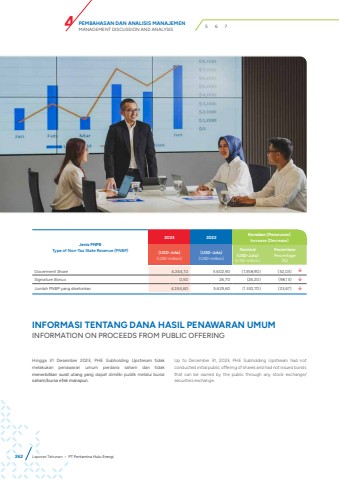 Jenis PNPBType of Non-Tax State Revenue (PNBP)2023 2022 Kenaikan (Penurunan)Increase (Decrease)(USD-Juta)(USD-million)(USD-Juta)(USD-million)Nominal(USD-Juta)(USD-million)PersentasePercentage(%)Goverment Share 4.244,10 5.602,90 (1.358,90) (32,03) %uf0e2Signature Bonus 0,50 26,70 (26,20) (98,13) %uf0e2Jumlah PNBP yang disetorkan 4.244,60 5.629,60 (1.332,70) (23,67) %uf0e2INFORMASI TENTANG DANA HASIL PENAWARAN UMUMINFORMATION ON PROCEEDS FROM PUBLIC OFFERING Hingga 31 Desember 2023, PHE Subholding Upstream tidak melakukan penawaran umum perdana saham dan tidak menerbitkan surat utang yang dapat dimiliki publik melalui bursa saham/bursa efek manapun.Up to December 31, 2023, PHE Subholding Upstream had not conducted initial public offering of shares and had not issued bonds that can be owned by the public through any stock exchange/securities exchange.262 Laporan Tahunan %u2022 PT Pertamina Hulu EnergiPEMBAHASAN DAN ANALISIS MANAJEMENMANAGEMENT DISCUSSION AND ANALYSIS 4 5 6 7