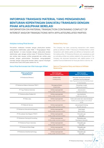 INFORMASI TRANSAKSI MATERIAL YANG MENGANDUNG BENTURAN KEPENTINGAN DAN/ATAU TRANSAKSI DENGAN PIHAK AFILIASI/PIHAK BERELASIINFORMATION ON MATERIAL TRANSACTION CONTAINING CONFLICT OF INTEREST AND/OR TRANSACTIONS WITH AFFILIATES/RELATED PARTIESKebijakan tentang Pihak BerelasiPerusahaan melakukan transaksi dengan pihak-pihak berelasi sebagaimana didefinisikan pada PSAK 7 %u201cPengungkapan Pihakpihak Berelasi%u201d, di mana transaksi dengan pihak-pihak berelasi didefinisikan yakni dengan entitas induk, PT Pertamina (Persero), dan entitas anak maupun entitas pengendali dan entitas yang berelasi dengan pemerintahan. Perusahaan mengungkapkan transaksi dengan pihak-pihak berelasi dalam Laporan Keuangan teraudit tahun buku 2023 pada catatan No. 44.Nama Pihak Bertransaksi dan Sifat Hubungan AfiliasiRelated Party PolicyThe Company has been conducting transactions with related parties as defined in PSAK 7 %u201cDisclosure of Related Parties%u201d, where transactions with related parties are defined as transactions with the holding entity, PT Pertamina (Persero), and subsidiaries as well as controlling entities and entities related to the government. The Company has disclosed transactions with related parties in its audited Financial Statements for fiscal year 2023 in note No. 44.Name of Transaction Party and Nature of Affiliate RelationshipPihak yang BerelasiRelated PartiesSifat HubunganNature of RelationshipSifat TransaksiNature of TransactionPT Pertamina (Persero) Entitas indukHolding entityPenjualan barang dan jasa dan pembelian barang daganganSale of goods and services and purchase of merchandisePT Pertamina Pedeve Indonesia (%u201cPDV%u201d) Pemegang SahamShareholderPenyertaan modalCapital participationPT Tugu Pratama Indonesia Entitas sepengendaliEntity under common control Jasa asuransiInsurance servicesPT Pertamina Bina Medika IHC Entitas sepengendaliEntity under common control Jasa kesehatanHealthcare servicesPT Patra Jasa Entitas sepengendaliEntity under common control Hotel, akomodasi dan sewa kendaraanHotels, accommodation and vehicle rentalPT Pelita Air Service Entitas sepengendaliEntity under common control Jasa pesawat terbangAircraft servicesPT Pertamina International Shipping Entitas sepengendaliEntity under common control Sewa kapalBoat charterPT Perusahaan Gas Negara (%u201cPGN%u201d) Entitas sepengendaliEntity under common control Penjualan gasGas salesPT Pertamina Training & Consulting Entitas sepengendaliEntity under common control Pembelian jasaPurchase of servicesPT Pertamina Power Indonesia Entitas sepengendaliEntity under common control Penjualan gasGas salesPT Pertamina Patra Niaga Entitas sepengendaliEntity under common control Penjualan gasGas salesPT Pertamina Geothermal Energy Entitas sepengendaliEntity under common control Penjualan gasGas salesPT Pertamina Hulu Energi %u2022 Annual Report 265