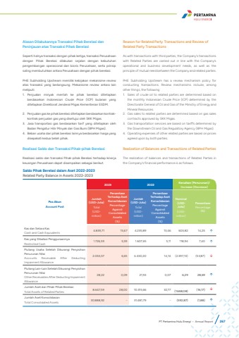 Alasan Dilakukannya Transaksi Pihak Berelasi dan Peninjauan atas Transaksi Pihak BerelasiSeperti halnya transaksi dengan pihak ketiga, transaksi Perusahaan dengan Pihak Berelasi dilakukan sejalan dengan kebutuhan pengembangan operasional dan bisnis Perusahaan, serta prinsip saling membutuhkan antara Perusahaan dengan pihak berelasi.PHE Subholding Upstream memiliki kebijakan mekanisme review atas transaksi yang berlangsung. Mekanisme review antara lain meliputi:1. Penjualan minyak mentah ke pihak berelasi ditetapkan berdasarkan Indonesian Crude Price (ICP) bulanan yang ditetapkan Direktorat Jenderal Migas Kementerian ESDM.2. Penjualan gas ke pihak berelasi ditetapkan berdasarkan kontrakkontrak penjualan gas yang disetujui oleh SKK Migas.3. Jasa transportasi gas berdasarkan tarif yang ditetapkan oleh Badan Pengatur Hilir Minyak dan Gas Bumi (BPH Migas).4. Beban usaha dari pihak berelasi lainnya berdasarkan harga yang disepakati kedua belah pihak.Realisasi Saldo dan Transaksi Pihak-pihak Berelasi Realisasi saldo dan transaksi Pihak-pihak Berelasi terhadap kinerja keuangan Perusahaan dapat disampaikan sebagai berikut.Reason for Related Party Transactions and Review of Related Party TransactionsAs with transactions with third parties, the Company%u2019s transactions with Related Parties are carried out in line with the Company%u2019s operational and business development needs, as well as the principle of mutual need between the Company and related parties.PHE Subholding Upstream has a review mechanism policy for conducting transactions. Review mechanisms include, among other things, the following:1. Sales of crude oil to related parties are determined based on the monthly Indonesian Crude Price (ICP) determined by the Directorate General of Oil and Gas of the Ministry of Energy and Mineral Resources.2. Gas sales to related parties are determined based on gas sales contracts approved by SKK Migas.3. Gas transportation services are based on tariffs determined by the Downstream Oil and Gas Regulatory Agency (BPH Migas).4. Operating expenses of other related parties are based on prices agreed upon by both parties.Realization of Balances and Transactions of Related Parties The realization of balances and transactions of Related Parties in the Company%u2019s financial performance is as follows.Saldo Pihak Berelasi dalam Aset 2022-2023Related Party Balance in Assets 2022-2023Pos AkunAccount Post2023 2022 Kenaikan (Penurunan)/Increase (Decrease)Jumlah(USD-Juta)Total(USDmillion)Persentase Terhadap Aset KonsolidasianPercentage Against Consolidated Assets(%)Jumlah(USD-Juta)Total(USDmillion)Persentase Terhadap Aset KonsolidasianPercentage Against Consolidated Assets(%)Nominal (USDJuta)(USDmillion)PersentasePercentage(%)Kas dan Setara KasCash and Cash Equivalents 4.839,71 15,67 4.235,89 13,46 603,82 14,25 %uf0e1Kas yang Dibatasi PenggunaannyaRestricted Cash 1.726,59 5,59 1.607,65 5,11 118,94 7,40 %uf0e1Piutang Usaha Setelah Dikurangi Penyisihan Penurunan NilaiAccounts Receivable After Deducting Impairment Allowance2.053,07 6,65 4.450,20 14,14 (2.397,13) (53,87) %uf0e2Piutang Lain-Lain Setelah Dikurangi Penyisihan Penurunan NilaiOther Receivables After Deducting Impairment Allowance28,22 0,09 21,93 0,07 6,29 28,69 %uf0e1Jumlah Aset dari Pihak-Pihak BerelasiTotal Assets of Related Parties 8.647,59 28,00 10.315,66 32,77 (1.668,08) (16,17) %uf0e2Jumlah Aset KonsolidasianTotal Consolidated Assets 30.888,92 - 31.481,79 - (592,87) (1,88) %uf0e1PT Pertamina Hulu Energi %u2022 Annual Report 267