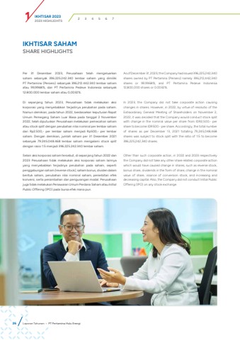IKHTISAR 2023 1 2023 HIGHLIGHTS 2 3 4 5 6 726 Laporan Tahunan %u2022 PT Pertamina Hulu EnergiIKHTISAR SAHAMSHARE HIGHLIGHTSPer 31 Desember 2023, Perusahaan telah mengeluarkan saham sebanyak 396.225.242.340 lembar saham yang dimiliki PT Pertamina (Persero) sebanyak 396.212.442.340 lembar saham atau 99,9968%, dan PT Pertamina Pedeve Indonesia sebanyak 12.800.000 lembar saham atau 0,0032%.Di sepanjang tahun 2023, Perusahaan tidak melakukan aksi korporasi yang menyebabkan terjadinya perubahan pada saham. Namun demikian, pada tahun 2022, berdasarkan keputusan Rapat Umum Pemegang Saham Luar Biasa pada tanggal 2 November 2022, telah diputuskan Perusahaan melakukan pemecahan saham atau stock split dengan perubahan nilai nominal per lembar saham dari Rp2.500,- per lembar saham menjadi Rp500,- per lembar saham. Dengan demikian, jumlah saham per 31 Desember 2021 sebanyak 79.245.048.468 lembar saham mengalami stock split dengan rasio 1:5 menjadi 396.225.242.340 lembar saham.Selain aksi korporasi saham tersebut, di sepanjang tahun 2022 dan 2023 Perusahaan tidak melakukan aksi korporasi saham lainnya yang menyebabkan terjadinya perubahan pada saham, seperti penggabungan saham (reverse stock), saham bonus, dividen dalam bentuk saham, perubahan nilai nominal saham, penerbitan efek konversi, serta penambahan dan pengurangan modal. Perusahaan juga tidak melakukan Penawaran Umum Perdana Saham atau Initial Public Offering (IPO) pada bursa efek mana pun.As of December 31, 2023, the Company had issued 396,225,242,340 shares owned by PT Pertamina (Persero) namely 396,212,442,340 shares or 99.9968%, and PT Pertamina Pedeve Indonesia 12,800,000 shares or 0.0032%.In 2023, the Company did not take corporate action causing changes in shares. However, in 2022, by virtue of resolutio of the Extraordinary General Meeting of Shareholders on November 2, 2022, it was decided that the Company would conduct stock split with change in the nominal value per share from IDR2,500.- per share to become IDR500.- per share. Accordingly, the total number of shares as per December 13, 2021 totalling 79,245,048,468 shares was subject to stock split with the ratio of 1:5 to become 396,225,242,340 shares. Other than such corporate action, in 2022 and 2023 respectively the Company did not take any other share related corporate action which would have caused change in shares, such as reverse stock, bonus share, dividends in the form of share, change in the nominal value of share, issance of conversion stock, and increasing and decreasing capital. Also, the Company did not conduct Initial Public Offering (IPO) on any stock exchange.
