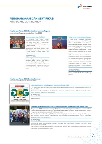 PT Pertamina Hulu Energi %u2022 Annual Report 27PENGHARGAAN DAN SERTIFIKASIAWARDS AND CERTIFICATIONTaiwan Innotech Expo (TIE) 2023PT Pertamina Hulu Energi meraih penghargaan pada Taiwan Innotech Expo (TIE) 2023, terdiri dari 1 Medali Emas, 2 Medali Perak, 1 Medali Perunggu, dan 3 Special Awards.PT Pertamina Hulu Energi received recognition at the Taiwan Innotech Expo (TIE) 2023, comprising 1 Gold Medal, 2 Silver Medals, 1 Bronze Medal, and 3 Special Awards.14 Oktober 2023October 14, 2023Dewan Pengembangan Perdagangan Eksternal Taiwan (TAITRA) dan Institut Penelitian Teknologi Industri (ITRI)Institution Granting Award: Taiwan External Trade Development Council (TAITRA) and Industrial Technology Research Institute (ITRI) Global Corporate Sustainable Awards3 (Tiga) Anak Perusahaan Subholding Upstream Pertamina yaitu PEP Donggi Matindok Field, PEP Sukowati Field, dan Pertamina Hulu Mahakam berhasil meraih penghargaan kategori Best Practice Awards dalam ajang Global Corporate Sustainable Awards di Taiwan 1 Medali Emas, 2 Medali Perak, 1 Medali Perunggu, dan 3 Special Awards.3 (Three) Subholding Upstream subsidiaries of Pertamina namely PEP Donggi Matindok, PEP Sukowati, and Pertamina Hulu Mahakam were received award in the Best Practice Awards category at the Global Corporate Sustainable Awards in Taiwan, 1 Gold Medal, 2 Silver Medals, 1 Bronze Medal, and 3 Special Awards.15 November 2023November 15, 2023Taiwan Institute for Sustainable Energy (TAISE)Penghargaan Tahun 2023 Berskala Internasional/RegionalInternational/Regional Award of the Year 2023Penghargaan Tahun 2023 Berskala NasionalNational Scale Award of the Year 2023Indonesia Excellence Good Corporate Governance Awards 2023PHE subholding upstream Raih Penghargaan di Ajang Indonesia Excellence Good Corporate Governance Awards 2023.Pertamina Hulu Energi (PHE), as the Subholding Upstream, has been honored at the Indonesia Excellence Good Corporate Governance Awards 2023.31 January 2023January 31, 2023Warta EkonomiCorporate Social Responsibility (CSR) & Pengembangan Desa Berkelanjutan (PDB) Awards 2023Penghargaan: PT Pertamina Hulu Energi (PHE) selaku Subholding Upstream Pertamina bersama seluruh regional dan anak perusahaan meraih 8 penghargaan dalam ajang Corporate Social Responsibility (CSR) & Pengembangan Desa Berkelanjutan (PDB) Awards 2023.Awards: PT Pertamina Hulu Energi (PHE), as the Subholding Upstream of Pertamina, along with all its regional and subsidiary entities, attained 8 accolades at the Corporate Social Responsibility (CSR) & Sustainable Village Development Awards 2023.31 January 2023January 31, 2023Kementerian Desa, Pembangunan Daerah Tertinggal dan Transmigrasi dengan Indonesian Social Sustainability Forum (ISSF).The Ministry of Village, Development of Disadvantaged Regions, and Transmigration collaborated with the Indonesian Social Sustainability Forum.