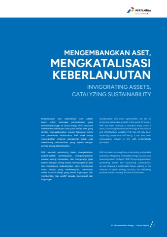 MENGEMBANGKAN ASET, MENGKATALISASI KEBERLANJUTANINVIGORATING ASSETS,CATALYZING SUSTAINABILITYKeberlanjutan dan optimalisasi aset adalah kunci untuk mencapai pertumbuhan yang berkesinambungan di dunia energi. PHE berusaha memberikan kehidupan baru pada setiap aset yang dimiliki, menggabungkan inovasi teknologi terkini dan pembaruan infrastruktur. PHE tidak hanya meningkatkan efisiensi operasional tetapi juga mendorong pertumbuhan yang sejalan dengan prinsip-prinsip keberlanjutan.PHE menjadi pendorong dalam mengkatalisasi praktik-praktik berkelanjutan, mengintegrasikan sumber energi terbarukan, dan mengurangi jejak karbon. Dengan sinergi antara membangkitkan aset dan mendukung keberlanjutan, kami membentuk masa depan yang berkelanjutan, memimpin dalam industri energi yang ramah lingkungan, dan memberikan nilai positif kepada masyarakat dan lingkungan.Sustainability and asset optimization are key to achieving sustainable growth in the world of energy. PHE has been striving to revitalize every asset it owns, combining the latest technological innovations and infrastructure updates. PHE has not only been improving operational efficiency, it has also been encouraging growth in line with sustainability principles. PHE has been a driving force in recording sustainable practices, integrating renewable energy sources, and reducing carbon footprint. With the synergy between generating assets and supporting sustainability, we are shaping a sustainable future, leading in the direction of green energy industry, and delivering positive value to society and the environment.PT Pertamina Hulu Energi %u2022 Annual Report 1