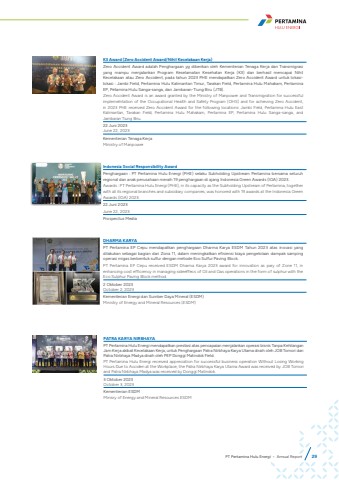 PT Pertamina Hulu Energi %u2022 Annual Report 29Indonesia Social Responsibility AwardPenghargaan : PT Pertamina Hulu Energi (PHE) selaku Subholding Upstream Pertamina bersama seluruh regional dan anak perusahaan meraih 19 penghargaan di ajang Indonesia Green Awards (IGA) 2023.Awards : PT Pertamina Hulu Energi (PHE), in its capacity as the Subholding Upstream of Pertamina, together with all its regional branches and subsidiary companies, was honored with 19 awards at the Indonesia Green Awards (IGA) 2023. 22 Juni 2023June 22, 2023Prospectus MediaK3 Award (Zero Accident Award/Nihil Kecelakaan Kerja)Zero Accident Award adalah Penghargaan yg diberikan oleh Kementerian Tenaga Kerja dan Transmigrasi yang mampu menjalankan Program Keselamatan Kesehatan Kerja (K3) dan berhasil mencapai Nihil Kecelakaan atau Zero Accident, pada tahun 2023 PHE mendapatkan Zero Accident Award untuk lokasilokasi : Jambi Field, Pertamina Hulu Kalimantan Timur, Tarakan Field, Pertamina Hulu Mahakam, Pertamina EP, Petamina Hulu Sanga-sanga, dan Jambaran-Tiung Biru (JTB).Zero Accident Award is an award granted by the Ministry of Manpower and Transmigration for successful implemelntation of the Occupational Health and Safety Program (OHS) and for achieving Zero Accident, in 2023 PHE received Zero Accident Award for the following locations: Jambi Field, Pertamina Hulu East Kalimantan, Tarakan Field, Pertamina Hulu Mahakam, Pertamina EP, Pertamina Hulu Sanga-sanga, and Jambaran Tiung Biru.22 Juni 2023June 22, 2023Kementerian Tenaga KerjaMinistry of ManpowerDHARMA KARYAPT Pertamina EP Cepu mendapatkan penghargaan Dharma Karya ESDM Tahun 2023 atas inovasi yang dilakukan sebagai bagian dari Zona 11, dalam meningkatkan efisiensi biaya pengelolaan dampak samping operasi migas berbentuk sulfur dengan metode Eco Sulfur Paving Block.PT Pertamina EP Cepu received ESDM Dharma Karya 2023 award for innovation as pary of Zone 11, in enhancing cost efficiency in managing sideeffecs of Oil and Gas operations in the form of sulphur with the Eco Sulphur Paving Block method.2 Oktober 2023October 2, 2023Kementerian Energi dan Sumber Daya Mineral (ESDM)Ministry of Energy and Mineral Resources (ESDM)PATRA KARYA NIRBHAYA PT Pertamina Hulu Energi mendapatkan prestasi atas pencapaian menjalankan operasi bisnis Tanpa Kehilangan Jam Kerja akibat Kecelakaan Kerja, untuk Penghargaan Patra Nirbhaya Karya Utama diraih oleh JOB Tomori dan Patra Nirbhaya Madya diraih oleh PEP Donggi Matindok Field.PT Pertamina Hulu Energi received appreciation for successful business operation Without Losing Working Hours Due to Acciden at the Workplace, the Patra Nirbhaya Karya Utama Award was received by JOB Tomori and Patra Nirbhaya Madya was received by Donggi Matindok.3 Oktober 2023October 3, 2023Kementerian ESDMMinisry of Energy and Mineral Resources ESDM