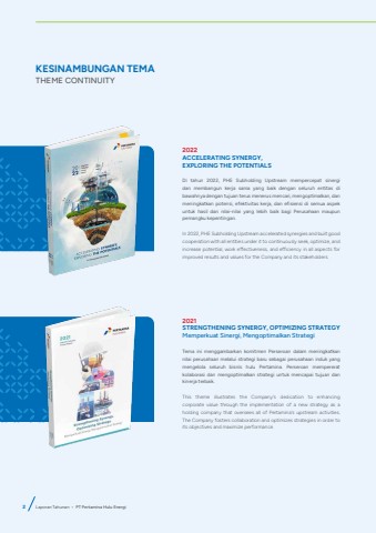 KESINAMBUNGAN TEMATHEME CONTINUITY2022ACCELERATING SYNERGY, EXPLORING THE POTENTIALSDi tahun 2022, PHE Subholding Upstream mempercepat sinergi dan membangun kerja sama yang baik dengan seluruh entitas di bawahnya dengan tujuan terus menerus mencari, mengoptimalkan, dan meningkatkan potensi, efektivitas kerja, dan efisiensi di semua aspek untuk hasil dan nilai-nilai yang lebih baik bagi Perusahaan maupun pemangku kepentingan.In 2022, PHE Subholding Upstream accelerated synergies and built good cooperation with all entities under it to continuously seek, optimize, and increase potential, work effectiveness, and efficiency in all aspects for improved results and values for the Company and its stakeholders.2021STRENGTHENING SYNERGY, OPTIMIZING STRATEGYMemperkuat Sinergi, Mengoptimalkan StrategiTema ini menggambarkan komitmen Perseroan dalam meningkatkan nilai perusahaan melalui strategi baru sebagai perusahaan induk yang mengelola seluruh bisnis hulu Pertamina. Perseroan mempererat kolaborasi dan mengoptimalkan strategi untuk mencapai tujuan dan kinerja terbaik.This theme illustrates the Company's dedication to enhancing corporate value through the implementation of a new strategy as a holding company that oversees all of Pertamina's upstream activities.The Company fosters collaboration and optimizes strategies in order to its objectives and maximize performance.2 Laporan Tahunan %u2022 PT Pertamina Hulu Energi