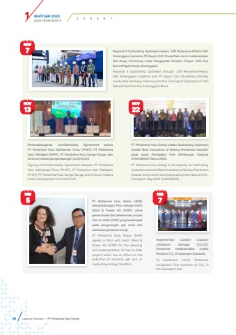 IKHTISAR 2023 1 2023 HIGHLIGHTS 2 3 4 5 6 738 Laporan Tahunan %u2022 PT Pertamina Hulu EnergiNOV7 Regional 3 Subholding Upstream melalui JOB Pertamina-Medco E&P Simenggaris bersama PT Kayan LNG Nusantara resmi melaksanakan Sail Away Ceremony untuk Pengapalan Perdana Ekspor LNG Gas Bumi Wilayah Kerja Simenggaris.Regional 3 Subholding Upstream through JOB Pertamina-Medco E&P Simenggaris together with PT Kayan LNG Nusantara officially conducted Sail Away Ceremony for the First Export Shipment of LNG Natural Gas from the Simenggaris Block.PT Pertamina Hulu Rokan (PHR) menandatangani MoU dengan Earth Wind & Power AS (EWP) untuk perencanaan dan pelaksanaan proyek Gas-to-Data (G2D) yang berdampak pada pengurangan gas emisi dan mendukung transisi energi.PT Pertamina Hulu Rokan (PHR) signed a MoU with Earth Wind & Power AS (EWP) for the planning and implementation of Gas-to-Data project which has an effect on the reduction of emission gas and on supporting energy transition.Impementasi Carbon Capture Utilization Storage (CCUS), Pertamina melaksanakan Injeksi Perdana CO2 di Lapangan Sukowati.To implement CCUS, Pertamina conducted First Injection of CO2 in the Sukowati Field.DES5DES 7NOV22PT Pertamina Hulu Energi selaku Subholding Upstream meraih %u2018Best Innovation of Bribery Prevention Awards%u2019 pada acara Peringatan Hari Antikorupsi Sedunia (HAKORDIA) Tahun 2023.PT Pertamina Hulu Energi in its capacity as Subholding Upstream received %u2018Best Innovation of Bribery Prevention Awards%u2019 at the event commemorating International AntiCorruption Day 2023 (HAKORDIA).NOV13Penandatanganan Confidentiality Agreement antara PT Pertamina Hulu Kalimantan Timur (PHKT), PT Pertamina Hulu Mahakam (PHM), PT Pertamina Hulu Sanga-Sanga, dan Chevron terkait pengembangan CCS/CCUS.Signing of Confidentiality Agreement between PT Pertamina Hulu Kalimantan Timur (PHKT), PT Pertamina Hulu Mahakam (PHM), PT Pertamina Hulu Sanga-Sanga, and Chevron related to the development of CCS/CCUS.