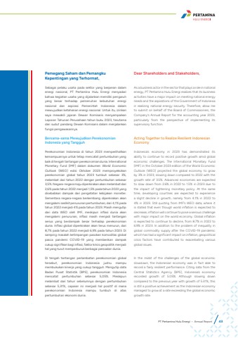 Pemegang Saham dan Pemangku Kepentingan yang Terhormat,Sebagai pelaku usaha pada sektor yang berperan dalam energi nasional, PT Pertamina Hulu Energi menyadari bahwa kegiatan usaha yang dijalankan memiliki pengaruh yang besar terhadap pemenuhan kebutuhan energi nasional dan aspirasi Pemerintah Indonesia dalam mewujudkan ketahanan energi nasional. Untuk itu, izinkan saya mewakili jajaran Dewan Komisaris menyampaikan Laporan Tahunan Perusahaan tahun buku 2023, terutama dari sudut pandang Dewan Komisaris dalam menjalankan fungsi pengawasannya.Bersama-sama Mewujudkan Perekonomian Indonesia yang TangguhPerekonomian Indonesia di tahun 2023 memperlihatkan kemampuannya untuk tetap mencatat pertumbuhan yang baik di tengah tantangan perekonomian dunia. International Monetary Fund (IMF) dalam dokumen World Economic Outlook (WEO) edisi Oktober 2023 memproyeksikan perekonomian global tahun 2023 tumbuh sebesar 3%, melambat dari tahun 2022 dengan pertumbuhan sebesar 3,5%. Negara-negara maju diperkirakan akan melambat dari 2,6% pada tahun 2022 menjadi 1,5% pada tahun 2023 yang disebabkan dampak dari pengetatan kebijakan moneter. Sementara negara-negara berkembang diperkirakan akan mengalami sedikit penurunan pertumbuhan, dari 4,1% pada tahun 2022 menjadi 4% pada tahun 2023. Masih mengutip dari data WEO oleh IMF, meskipun inflasi dunia akan mengalami penurunan, inflasi masih menjadi tantangan serius yang berdampak besar terhadap perekonomian dunia. Inflasi global diperkirakan akan terus menurun, dari 8,7% pada tahun 2022 menjadi 6,9% pada tahun 2023. Di samping masalah ketimpangan pasokan komoditas global pasca pandemi COVID-19 yang memberikan dampak cukup signifikan bagi inflasi, faktor krisis geopolitik menjadi hal yang turut memperburuk berbagai persoalan dunia.Di tengah tantangan perlambatan perekonomian global tersebut, perekonomian Indonesia justru mampu membukukan kinerja yang cukup tangguh. Mengutip data Badan Pusat Statistik (BPS), perekonomian Indonesia mencatat pertumbuhan sebesar 5,05%. Meskipun melambat dari tahun sebelumnya dengan pertumbuhan sebesar 5,31%, capaian ini menjadi hal positif di mana perekonomian Indonesia mampu tumbuh di atas pertumbuhan ekonomi dunia.Dear Shareholders and Stakeholders,As a business actor in the sector that plays a role in national energy, PT Pertamina Hulu Energi realizes that its business activities have a major impact on meeting national energy needs and the aspirations of the Government of Indonesia in realizing national energy security. Therefore, allow me to submit on behalf of the Board of Commissioners, the Company%u2019s Annual Report for the accounting year 2023, particularly from the perspective of implementing its supervisory function.Acting Together to Realize Resilient Indonesian EconomyIndonesia%u2019s economy in 2023 has demonstrated its ability to continue to record positive growth amid global economic challenges. The International Monetary Fund (IMF) in the October 2023 edition of the World Economic Outlook (WEO) projected the global economy to grow by 3% in 2023, slowing down compared to 2022 with the growth rate of 3.5%. Advanced economies are expected to slow down from 2.6% in 2022 to 1.5% in 2023 due to the impact of tightening monetary policy. At the same time, developing countries are expected to experience a slight decline in growth, namely from 4.1% in 2022 to 4% in 2023. Still quoting from IMF%u2019s WEO data, where it is stated that even though world inflation is expected to decrease, inflation will continue to pose a serious challenge with major impact on the world economy. Global inflation is expected to continue to decline, from 8.7% in 2022 to 6.9% in 2023. In addition to the problem of inequality in global commodity supply after the COVID-19 pandemic which has had a significant impact on inflation, geopolitical crisis factors have contributed to exacerbating various global issues.In the midst of the challenges of the global economic slowdown, the Indonesian economy was in fact able to record a fairly resilient performance. Citing data from the Central Statistics Agency (BPS), Indonesia%u2019s economy recorded growth of 5.05%. Although slowing down compared to the previous year with growth of 5.31%, this is still a positive achievement as the Indonesian economy managed to grow at a rate exceeding the global economic growth rate.PT Pertamina Hulu Energi %u2022 Annual Report 43