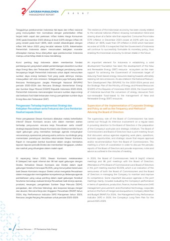 LAPORAN MANAJEMENMANAGEMENT REPORT 2 3 4 5 6 7Tangguhnya perekonomian Indonesia tak lepas dari inflasi nasional yang menunjukkan tren normalisasi dengan perlambatan inflasi terjadi lebih cepat dari perkiraan. Inflasi Indeks Harga Konsumen (IHK) pada Desember 2023 ditutup di level 2,61% dengan inflasi inti yang rendah pada level 1,80%, lebih rendah dibandingkan dengan inflasi IHK tahun 2022 yang tercatat sebesar 5,51%. Keberhasilan Pemerintah Indonesia dalam merumuskan kebijakan moneter diharapkan mampu terus dilanjutkan agar perekonomian Indonesia mampu untuk tetap stabil di masa mendatang.Kunci penting bagi Indonesia dalam membentuk fondasi pembangunan yang kokoh adalah perkembangan ekosistem sumber daya Energi Baru dan Terbarukan (EBT) sebagai pendukung utama tercapainya target Pemerintah Indonesia untuk dapat menurunkan sumber daya energi berbasis fosil yang pada akhirnya mampu mewujudkan net zero emission. Sebagaimana juga tertuang dalam Rencana Pembangunan Jangka Menengah Nasional (RPJMN) periode 2020-2024 dan Rencana Strategis Kementerian Energi dan Sumber Daya Mineral (ESDM) Republik Indonesia 2020-2024, Pemerintah Indonesia mencanangkan konversi sumber daya energi dari berbasis fosil tidak terbarukan menuju pengelolaan sumber daya Energi Baru dan Terbarukan (EBT).Pengawasan Terhadap Implementasi Strategi dan Kebijakan Perusahaan serta Frekuensi dan Cara Pemberian Nasihat kepada DireksiPeran pengawasan Dewan Komisaris dilakukan melalui keterlibatan intensif Dewan Komisaris secara rutin dalam memberi arahan terhadap penyusunan rencana kerja Perusahaan serta inisiatif strategis kepada Direksi. Dewan Komisaris dan Direksi memiliki forum rapat gabungan yang membahas berbagai agenda menyangkut rencana kerja, operasional, peluang usaha, serta isu-isu strategis yang memerlukan persetujuan dan/atau rekomendasi Dewan Komisaris. Rapat ini merupakan bentuk koordinasi dalam rangka membahas laporan-laporan periodik Direksi dan memberikan tanggapan, catatan dan nasihat yang dituangkan dalam risalah rapat.Di sepanjang tahun 2023, Dewan Komisaris melaksanakan 8 (delapan) kali rapat internal dan 38 kali rapat gabungan dengan Direksi. Kehadiran Dewan Komisaris dan Direksi dalam rapat gabungan tersebut mencapai 95,05%, yang menunjukkan keseriusan baik Dewan Komisaris maupun Direksi untuk mengelola Perusahaan dalam menjaga dan meningkatkan kompetensinya. Beberapa agenda pembahasan yang cukup penting dalam rapat gabungan tersebut terutama mencakup evaluasi kinerja Perusahaan baik kinerja operasi, produksi, keuangan, pengelolaan Sumber Daya Manusia (SDM), pengadaan, dan informasi teknologi; aksi korporasi berupa mergerdan akuisisi; Rencana Kerja dan Anggaran Perusahaan (RKAP) tahun 2024; Key Performance Indicator (KPI) Manajemen tahun 2023; Rencana Jangka Panjang Perusahaan untuk periode 2025-2029.The resilience of the Indonesian economy has been closely related to the national national inflation showing normalization trend and slowing down at a faster rate than expected. Consumer Price Index (CPI) inflation in December 2023 closed at 2.61% with low core inflation at 1.80%, lower than CPI inflation in 2022 which had been recorded at 5.51%. It is expected that the Government of Indonesia will continue to successfully formulate its monetary policy, thus enabling the Indonesian economy to remain stable in the future.An important element for Indonesia in establishing a solid development foundation has been the development of the New and Renewable Energy (EBT) resource ecosystem as the main support for achieving the Government of Indonesia%u2019s target of reducing fossil-based energy resources leading towards ultimately realizing net zero emissions. As also stated in the National MediumTerm Development Plan (RPJMN) for the 2020-2024 period and the Strategic Plan of the Ministry of Energy and Mineral Resources (ESDM) of the Republic of Indonesia 2020-2024, the Government of Indonesia launched the conversion of energy resources from non-renewable fossil-based to the management of New and Renewable Energy (EBT) resources.Supervision of the Implementation of Corporate Strategy and Policy as well as the Frequency and Method of Advising the Board of DirectorsThe supervisory role of the Board of Commissioners has been carried out through its intensive involvement on a regular basis in providing direction to the Board of Directors in the preparation of the Company%u2019s work plan and strategic initiatives. The Board of Commissioners and Board of Directors have a joint meeting forum that discusses various agendas regarding work plans, operations, business opportunities, and strategic issues that require approval and/or recommendation from the Board of Commissioners. This meeting is a form of coordination in order to discuss the periodic reports of the Board of Directors and provide responses, notes and advice as outlined in the minutes of meeting.In 2023, the Board of Commissioners held 8 (eight) internal meetings and 38 joint meetings with the Board of Directors. Attendance of the Board of Commissioners and Board of Directors in the joint meeting reached 95.05%, which is an indication of the seriousness of both the Board of Commissioners and the Board of Directors in managing the Company to maintain and improve its competence. Some important discussion agendas in the joint meetings mainly included evaluating the Company%u2019s performance in terms of operations, production, finance, Human Resources (HR) management, procurement, and information technology; corporate actions in the form of mergers and acquisitions; Company Work Plan and Budget (RKAP) for 2024; the Management%u2019s Key Performance Indicator (KPI) in 2023; the Company%u2019s Long-Term Plan for the period 2025-2029.44 Laporan Tahunan %u2022 PT Pertamina Hulu Energi