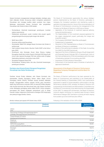 Dewan Komisaris mengapresiasi berbagai kebijakan strategis yang telah dilakukan Direksi, khususnya dalam mengelola operasional Perusahaan dan menjaga kualitas dalam produksi hulu migas. Beberapa rekomendasi Dewan Komisaris atas pengelolaan Perusahaan oleh Direksi di tahun 2023 adalah:%u2022 Pemberlakuan threshold kewenangan persetujuan investasi selama masa transisi.%u2022 Pelaksanaan persetujuan usulan investasi atas proyek oganik pengembangan khususnya proyek merger dan akuisisi.%u2022 RKAP tahun 2023.%u2022 Pendirian entitas anak Perusahaan.%u2022 Penempatan Wakil PHE sebagai Dewan Komisaris dan Direksi di entitas anak.%u2022 Hasil evaluasi kinerja Kantor Akuntan Publik (KAP) untuk tahun buku 2022.%u2022 Persetujuan atas Kerangka Acuan Kerja (Ruang Lingkup Penugasan Audit) dan Usulan Owner%u2019s Estimate (OE) biaya Audit Umum atas Laporan Keuangan PHE dan entitas anak di lingkup Subholding Upstream untuk tahun buku 2023.%u2022 Perubahan Anggaran Dasar PHE%u2022 Pemberlakuan ambang batas nilai atau threshold kewenangan persetujuan divestasi.Penilaian atas Kinerja Direksi Mengenai Pengelolaan Perusahaan dan Dasar PenilaiannyaPenilaian kinerja Direksi dilakukan oleh Dewan Komisaris dan disampaikan kepada Pemegang Saham dalam Rapat Umum Pemegang Saham (RUPS). Penilaian kinerja tersebut dilakukan dengan menggunakan kriteria evaluasi formal yang tercantum dalam Key Performance Indicator (KPI), di mana KPI Direksi diajukan oleh Komite Nominasi dan Remunerasi atau oleh Dewan Komisaris untuk ditetapkan pemegang saham dalam RUPS. Untuk mengukur pencapaian KPI, Direksi melakukan pemantauan rutin di setiap triwulan melalui mekanisme Performance Dialogue (PD) berjenjang dari pekerja hingga Direktur Utama.Berikut realisasi pencapaian KPI Direksi tahun 2023.The Board of Commissioners appreciates the various strategic policies implemented by the Board of Directors, particularly in managing the Company%u2019s operations and maintaining quality in upstream oil and gas production. Some of the recommendations of the Board of Commissioners concerning the management of the Company by the Board of Directors in 2023 are as follows:%u2022 Application of the threshold of investment approval authority during the transition period.%u2022 The implementation of the investment proposal agreement for the organic development project, particularly the merger and acquisition project.%u2022 The Company%u2019s 2023 RKAP (Work Plan and Budget).%u2022 Establishment of subsidiaries.%u2022 Placement of PHE Representatives as Board of Commissioners and Board of Directors in subsidiaries.%u2022 Results of the performance evaluation of the Public Accounting Firm (KAP) for the 2022 financial year.%u2022 Approval of the Terms of Reference (Scope of Audit Assignment) and Proposed Owner%u2019s Estimate (OE) of General Audit costs on the Financial Statements of PHE and subsidiaries within the scope of Subholding Upstream for accounting year 2023.%u2022 Amendment of PHE%u2019s Articles of Association%u2022 Enforcement of the threshold value or threshold of authority for approval of divestment.Assessment of the Board of Directors%u2019 Performance Regarding Company Management and the Basis for AssessmentThe Board of Directors%u2019 performance has been assessed by the Board of Commissioners and submitted to the Shareholders at the General Meeting of Shareholders (GMS). Such performance assessment is based on formal evaluation criteria listed in the Key Performance Indicators (KPI), whereby the Board of Directors%u2019 KPI is proposed by the Nomination and Remuneration Committee or by the Board of Commissioners to be determined by the Shareholders at the GMS. To measure KPI achievement, the Board of Directors conducts regular monitoring on a quarterly basis through a tiered Performance Dialogue (PD) mechanism involving all levels ranging from workers up to the Chief Executive Officer.Following is the realization of the s%u2019 KPI in 2023.DirektoratDirectorateRealisasi KPIKPI RealizationUtamaMain92,25Perencanaan Strategis & Pengembangan BisnisStrategic Planning & Business Development102,84Pengembangan & ProduksiDevelopment & Production102,84EksplorasiExploration102,88SDM & Penunjang BisnisHuman Capital & Corporate Services102,90KeuanganFinance102,74PT Pertamina Hulu Energi %u2022 Annual Report 45