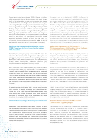 LAPORAN MANAJEMENMANAGEMENT REPORT 2 3 4 5 6 7Catatan penting bagi perkembangan GCG di lingkup Perusahaan adalah pengendalian internal dan pengelolaan risiko sesuai dengan bisnis inti dan penyesuaian terhadap tren pengelolaan risiko dewasa ini. Direksi bersama-sama dengan Dewan Komisaris telah berupaya untuk mengembangkan sistem pengendalian internal dan manajemen risiko sebagai salah satu agenda besar terkait perkembangan GCG. Tentunya sebagai bentuk dari komitmen kami mendukung praktik GCG yang semakin baik, kami menargetkan hasil rating ESG tahun 2024 juga dapat dipertahankan bahkan semakin baik, dengan itu Perusahaan membentuk tim khusus pelaksana ESG management. Selain itu, Perusahaan juga menargetkan pencapaian Tingkat Kesehatan Perusahaan di seluruh lini bisnis dan anak usaha juga semakin baik dan mengimplementasikan Permen BUMN No. PER-2/MBU/03/2023-Bab IV Pasal 76 untuk mendapatkan credit rating.Pandangan atas Pengelolaan Whistleblowing System(WBS) Perusahaan dan Peran Dewan Komisaris dalam WBS PerusahaanPerkembangan penerapan prinsip-prinsip GCG tak lepas dari kebutuhan Perusahaan untuk menghadirkan sistem pelaporan pelanggaran yang mandiri dan bebas dari kepentingan manapun. Keberadaan Sistem Pelaporan Pelanggaran, atau Whistleblowing System (WBS) memungkinkan mekanisme pelaporan yang menjamin kerahasiaan dan perlindungan bagi pelapor.Patut disampaikan bahwa mekanisme WBS yang dimiliki Perusahaan terintegrasi dalam WBS yang dikelola entitas induk, PT Pertamina (Persero). Hal ini dilakukan dalam rangka memperkuat penegakan prinsip GCG dalam satu kesatuan yang utuh di tubuh Pertamina Group. Integrasi pengelolaan WBS oleh entitas induk juga dilakukan untuk dapat meningkatkan pengawasan yang mandiri di lingkup Perusahaan, di mana seluruh pengaduan yang masuk akan diterima dan ditindaklanjuti oleh Fungsi WBS - Internal Audit PT Pertamina (Persero).Di sepanjang tahun 2023 Fungsi WBS - Internal Audit Pertamina telah menerima 94 laporan pengaduan dari lingkup Perusahaan. Hingga akhir tahun 2023, sebanyak 36 pengaduan berada dalam tahap analisis awal, 2 (dua) pengaduan dalam tahap waiting listinvestigasi, 12 pengaduan dalam tahap penanganan oleh fungsi terkait, dan 44 pengaduan telah terselesaikan.Penilaian atas Kinerja Organ Pendukung Dewan KomisarisPelaksanaan tugas pengawasan oleh Dewan Komisaris tak lepas dari peran kinerja organ pendukungnya, yang terdiri dari Sekretaris Dewan Komisaris, Komite Audit, Komite Nominasi dan Remunerasi, dan Komite Investasi. Penilaian terhadap kinerja organ pendukung tersebut dilakukan melalui pelaksanaan tugas dan fungsinya serta pelaporan yang telah diberikan oleh masing-masing organ, yang kemudian tertuang dalam Key Performance Indicator (KPI) masingmasing organ pendukung.An important note for the development of GCG in the Company is internal control and risk management in accordance with the core business and adjustments to current risk management trends. The Board of Directors together with the Board of Commissioners have strived to develop an internal control system and risk management as one of the major agendas related to GCG development. Naturally, as a form of our commitment to support better GCG practices, we expect that the results of the ESG rating in 2024 can also be maintained and even improved further, hence the Company has formed a special team for implementing ESG management. In addition to the foregoing, the achievement of the Company%u2019s Soundness Level in all business lines and subsidiaries has also been improving and SOE Regulation No. PER-2/MBU/03/2023-Chapter IV Article 76 to carry out credit ratings by independent credit rating.Views on the Management of the Company%u2019s Whistleblowing System (WBS) and the Role of the Board of Commissioners in the Company%u2019s WBSThe development of the implementation of GCG principles is inseparable from the Company%u2019s need to have in place a violation reporting system which is independent and free from any interests. The existing Whistleblowing System (WBS) allows a reporting mechanism that guarantees confidentiality and protection for whistleblowers.It needs to be mentioned that the Company%u2019s WBS mechanism is integrated in the WBS managed by the holding entity, PT Pertamina (Persero). It hsd nrrn for the purpose of strengthening the enforcement of GCG principles in an integral unity in the Pertamina Group. The integration of WBS management by the holding entity is also aimed at creating improved independent supervision in the Company, where all incoming complaints are received and followed up by the WBS - Internal Audit Function of PT Pertamina (Persero).In 2023, Pertamina%u2019s WBS - Internal Audit Function has received 94 complaint reports within the scope of Company. Up to the end of 2023, a total of 36 complaints were in the initial analysis stage, 2 (two) complaints were in the stage of investigation waiting list, 12 complaints were in the stage of handling by related functions, and 44 complaints had been resolved.Assessment of the Performance of the Board of Commissioners%u2019 Supporting Organs The implementation of the Board of Commissioners%u2019 supervisory function is intertwined with the role of its supporting organs, consisting of the Secretary of the Board of Commissioners, Audit Committee, Nomination and Remuneration Committee, and Investment Committee. The performance of the supporting organs has been assessed based on the implementation of their respective duties and functions as well as their respective reports subsequently set out in the Key Performance Indicator (KPI) of each supporting organ.50 Laporan Tahunan %u2022 PT Pertamina Hulu Energi