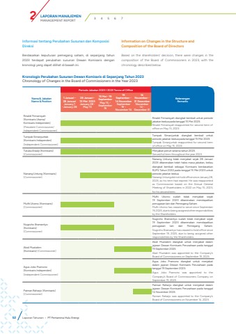LAPORAN MANAJEMENMANAGEMENT REPORT 2 3 4 5 6 7Informasi tentang Perubahan Susunan dan Komposisi DireksiBerdasarkan keputusan pemegang saham, di sepanjang tahun 2023 terdapat perubahan susunan Dewan Komisaris dengan kronologi yang dapat dilihat di bawah ini.Nama & JabatanName & PositionPeriode Jabatan 2023 I 2023 Terms of Office KeteranganRemarks1 Januari - 28 Januari January 1 -January 28 28 Januari - 15 Mei 2023January 28 - May 1515 Mei - 19 September May 15, - September 1919 September - 14 NovemberSeptember 19 - November 1414 November - 31 DesemberNovember 14 - December 31 Rinaldi Firmansyah (Komisaris Utama/Komisaris Independen)(President Commissioner/Independent Commissioner)Rinaldi Firmansyah diangkat kembali untuk periode jabatan kedua pada tanggal 15 Mei 2023.Rinaldi Firmansyah reappointed for second term of office on May 15, 2023.Tumpak Simanjuntak (Komisaris Independen)(Independent Commissioner)Tumpak Simanjuntak diangkat kembali untuk periode jabatan kedua pada tanggal 15 Mei 2023.Tumpak Simanjuntak reappointed for second term of office on May 15, 2023.Tutuka Ariadji (Komisaris)(Commissioner)Menjabat penuh selama tahun 2023.Served full term throughout the year 2023.Nanang Untung (Komisaris)(Commissioner)Nanang Untung tidak menjabat sejak 28 Januari 2023 dikarenakan telah habis masa jabatan, beliau diangkat kembali sebagai Komisaris berdasarkan RUPS Tahun 2022 pada tanggal 15 Mei 2023 untuk periode jabatan kedua. Nanang Untung did not hold office since January 28, 2023, as his term had expired. He was reappointed as Commissioner based on the Annual General Meeting of Shareholders in 2022 on May 15, 2023, for his second term.Mufti Utomo (Komisaris)(Commissioner)Mufti Utomo sudah tidak menjabat sejak 19 September 2023 dikarenakan mendapatkan penugasan lain dari Pemegang Saham. Mufti Utomo has ceased to serve since September 19, 2023, due to being assigned other responsibilities by the Shareholders.Nugroho Bramantyo (Komisaris)(Commissioner)Nugroho Bramantyo sudah tidak menjabat sejak 19 September 2023 dikarenakan mendapatkan penugasan lain dari Pemegang Saham.Nugroho Bramantyo has ceased to hold office since September 19, 2023, due to being assigned other responsibilities by the Shareholders.Abdi Mustakim(Komisaris) (Commissioner)Abdi Mustakim diangkat untuk menjabat dalam jajaran Dewan Komisaris Perusahaan pada tanggal 19 September 2023.Abdi Mustakim was appointed to the Company%u2019s Board of Commissioners on September 19, 2023.Agus Joko Pramono (Komisaris Independen) (Independent Commissioner)Agus Joko Pramono diangkat untuk menjabat dalam jajaran Dewan Komisaris Perusahaan pada tanggal 19 September 2023.Agus Joko Pramono was appointed to the Company%u2019s Board of Commissioners Company on September 19, 2023.Paiman Raharjo (Komisaris) (Commissioner)Paiman Raharjo diangkat untuk menjabat dalam jajaran Dewan Komisaris Perusahaan pada tanggal 14 November 2023.Paiman Raharjo was appointed to the Company%u2019s Board of Commissioners on November 14, 2023.Kronologis Perubahan Susunan Dewan Komisaris di Sepanjang Tahun 2023Chronology of Changes in the Board of Commissioners in the Year 2023Information on Changes in the Structure and Composition of the Board of Directors Based on the shareholders%u2019 decision, there were changes in the composition of the Board of Commissioners in 2023, with the chronology described below.52 Laporan Tahunan %u2022 PT Pertamina Hulu Energi