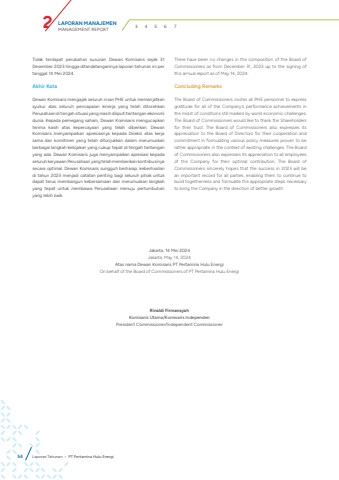 LAPORAN MANAJEMENMANAGEMENT REPORT 2 3 4 5 6 7Tidak terdapat perubahan susunan Dewan Komisaris sejak 31 Desember 2023 hingga ditandatanganinya laporan tahunan ini per tanggal 14 Mei 2024.Akhir KataDewan Komisaris mengajak seluruh insan PHE untuk memanjatkan syukur atas seluruh pencapaian kinerja yang telah ditorehkan Perusahaan di tengah situasi yang masih diliputi tantangan ekonomi dunia. Kepada pemegang saham, Dewan Komisaris mengucapkan terima kasih atas kepercayaan yang telah diberikan. Dewan Komisaris menyampaikan apresiasnya kepada Direksi atas kerja sama dan komitmen yang telah ditunjukkan dalam merumuskan berbagai langkah kebijakan yang cukup tepat di tengah tantangan yang ada. Dewan Komisaris juga menyampaikan apresiasi kepada seluruh karyawan Perusahaan yang telah memberikan kontribusinya secara optimal. Dewan Komisaris sungguh berharap, keberhasilan di tahun 2023 menjadi catatan penting bagi seluruh pihak untuk dapat terus membangun kebersamaan dan merumuskan langkah yang tepat untuk membawa Perusahaan menuju pertumbuhan yang lebih baik.Jakarta, 14 Mei 2024Jakarta, May 14, 2024Atas nama Dewan Komisaris PT Pertamina Hulu EnergiOn behalf of the Board of Commissioners of PT Pertamina Hulu EnergiRinaldi FirmansyahKomisaris Utama/Komisaris IndependenPresident Commissioner/Independent CommissionerThere have been no changes in the composition of the Board of Commissioners as from December 31, 2023 up to the signing of this annual report as of May 14, 2024.Concluding RemarksThe Board of Commissioners invites all PHE personnel to express gratitude for all of the Company%u2019s performance achievements in the midst of conditions still marked by world economic challenges. The Board of Commissioners would like to thank the Shareholders for their trust. The Board of Commissioners also expresses its appreciation to the Board of Directors for their cooperation and commitment in formulating various policy measures proven to be rather appropriate in the context of existing challenges. The Board of Commissioners also expresses its appreciation to all employees of the Company for their optimal contribution. The Board of Commissioners sincerely hopes that the success in 2023 will be an important record for all parties. enabling them to continue to build togetherness and formulate the appropriate steps necessary to bring the Company in the direction of better growth.54 Laporan Tahunan %u2022 PT Pertamina Hulu Energi