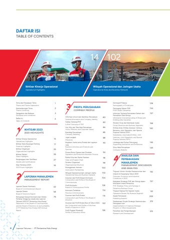 DAFTAR ISI TABLE OF CONTENTSTema dan Penjelasan TemaTheme and Theme Explanation1Kesinambungan TemaTheme Continuity 2Sanggahan dan BatasanDisclaimer and Limitations3Daftar IsiTable of Contents41 IKHTISAR 20232023 HIGHLIGHTSIkhtisar Kinerja OperasionalOperational Highlights14Ikhtisar Data Keuangan PentingFinancial Highlights17Ikhtisar OrganisasiOrganizational Highlights25Ikhtisar SahamShare Highlights26Penghargaan dan SertifikasiAwards and Certifications27Kilas Peristiwa 20232023 Event Highlights342 LAPORAN MANAJEMEN MANAGEMENT REPORTLaporan Dewan KomisarisBoard of Commisstioner%u2019s Report42 Laporan DireksiBoard of Director%u2019s Report58Pernyataan Dewan Komisaris dan Direksi Tentang Tanggung Jawab atas Laporan Tahunan 2023 PT Pertamina Hulu EnergiStatement of the Board of Commissioners and the Board of Directors on Accountability of PT Pertamina Hulu Energi 2023 Annual Report763 PROFIL PERUSAHAAN COMPANY PROFILEInformasi Umum dan Identitas PerusahaanGeneral Information and Company Identity80Sekilas Tentang PHEA Brief Overview of PHE82Visi, Misi, dan Tata Nilai PerusahaanVision, Missions, and Corporate Values84Branding PerusahaanCompany Branding86Jejak LangkahMilestone88Kegiatan Usaha serta Produk dan Layanan JasaBusiness Activities and Products and Services90Proses Bisnis Operasi dan ProduksiOperation and Production Business Process94Rantai Nilai dan Rantai PasokanValue and Supply Chain96Struktur OrganisasiOrganizational Structure98Keanggotaan AsosiasiAssociation Membership100Wilayah Operasional dan Jaringan UsahaOperational Area and Business Network102Susunan dan Profil Dewan KomisarisComposition and Profile of the Board of Commissioners104Profil KomisarisBoard of Commissioners Profile106Komisaris TerdahuluPrevious Commissioners114Susunan dan Profil DireksiComposition and Profile of the Board of Directors115Susunan dan Profil Direksi Baru di Tahun 2024the Composition and Profiles of the New Board of Directors in 2024122Profil Pejabat EksekutifProfile of Executive officer126Demografi PekerjaDemography of Employees128Pemegang Saham PHEPHE%u2019s Share Ownership134Informasi Tentang Pencatatan Saham dan Penerbitan Efek lainnyaInformation Concerning Listing of Shares and Emitting other Securities137Struktur Grup dan Kelompok UsahaGroup Structure and Business Segments138Entitas Anak, Entitas Asosiasi, Ventura Bersama, Joint Operation, dan Special Purpose Vehicle (SPV)Subsidiaries, Associated Entities, Joint Ventures, Joint Operations, and Special Purpose Vehicles (SPV)140Lembaga dan Profesi PenunjangSupporting Institutions and Professions146Situs Web PerusahaanCompany Website1494 ANALISA DAN PEMBAHASAN MANAJEMENMANAGEMENT DISCUSSION AND ANALYSISTinjauan Umum: Kondisi Perekonomian dan Industri di Sepanjang Tahun 2023Overvie Economic and Industrial Conditions in 2023152Kebijakan Strategis PHE dan Sinergi dalam Kelompok Usaha PertaminaPHE Strategic Policy and Synergy in Pertamina Business Group157Tinjauan Operasi Per Segmen UsahaOperations Review Per Business Segment161Aspek PemasaranMarketing Aspects209Pelaksanaan Proyek Strategis Nasional atau Penugasan LainImplementation of National Strategic Projects or Other Assignments212Penelitian dan PengembanganResearch and Development21514Ikhtisar Kinerja OperasionalOperational Highlights102Wilayah Operasional dan Jaringan UsahaOperational Area and Business Network4 Laporan Tahunan %u2022 PT Pertamina Hulu Energi