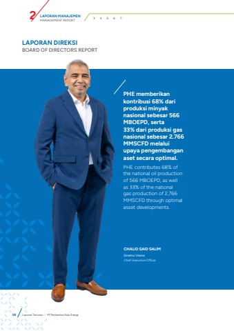LAPORAN MANAJEMENMANAGEMENT REPORT 2 3 4 5 6 7LAPORAN DIREKSIBOARD OF DIRECTORS REPORTCHALID SAID SALIMDirektur UtamaChief Executive OfficerPHE memberikan kontribusi 68% dari produksi minyak nasional sebesar 566 MBOEPD, serta 33% dari produksi gas nasional sebesar 2.766 MMSCFD melalui upaya pengembangan aset secara optimal.PHE contributes 68% of the national oil production of 566 MBOEPD, as well as 33% of the national gas production of 2,766 MMSCFD through optimal asset developments.58 Laporan Tahunan %u2022 PT Pertamina Hulu Energi