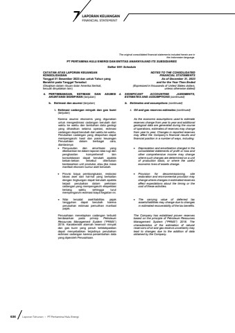 634 Laporan Tahunan %u2022 PT Pertamina Hulu EnergiLAPORAN KEUANGAN 7 FINANCIAL STATEMENTThe original consolidated financial statements included herein are in the Indonesian language.PT PERTAMINA HULU ENERGI DAN ENTITAS ANAKNYA/AND ITS SUBSIDIARIESDaftar 5/81 ScheduleCATATAN ATAS LAPORAN KEUANGANKONSOLIDASIANTanggal 31 Desember 2023 dan untuk Tahun yang Berakhir pada Tanggal Tersebut(Disajikan dalam ribuan dolar Amerika Serikat, kecuali dinyatakan lain)NOTES TO THE CONSOLIDATEDFINANCIAL STATEMENTS As of December 31, 2023and for the Year Then Ended(Expressed in thousands of United States dollars,unless otherwise stated)4. PERTIMBANGAN, ESTIMASI DAN ASUMSIAKUNTANSI SIGNIFIKAN (lanjutan)4. SIGNIFICANT ACCOUNTING JUDGMENTS, ESTIMATES AND ASSUMPTIONS (continued)b. Estimasi dan asumsi (lanjutan) b. Estimates and assumptions (continued)i. Estimasi cadangan minyak dan gas bumi(lanjutan)i. Oil and gas reserves estimates (continued)Karena asumsi ekonomis yang digunakanuntuk mengestimasi cadangan berubah dariwaktu ke waktu dan tambahan data geologiyang dihasilkan selama operasi, estimasicadangan dapat berubah dari waktu ke waktu.Perubahan cadangan yang dilaporkan dapatmempengaruhi hasil dan posisi keuanganPerusahaan dalam berbagai cara,diantaranya:As the economic assumptions used to estimate reserves change from year to year and additional geological data are generated during the course of operations, estimates of reserves may change from year to year. Changes in reported reserves may affect the Company%u2019s financial results and financial position in a number of ways, including:%u2022 Penyusutan dan amortisasi yangdibebankan ke dalam laporan laba rugi dan penghasilan komprehensif lainkonsolidasian dapat berubah apabilabeban-beban tersebut ditentukanberdasarkan unit produksi, atau jika masamanfaat ekonomi sumur aset berubah.%u2022 Depreciation and amortization charged in the consolidated statements of profit or loss andother comprehensive income may changewhere such charges are determined on a unit of production basis, or where the usefuleconomic lives of assets change.%u2022 Provisi biaya pembongkaran, restorasilokasi aset dan hal-hal yang berkaitandengan lingkungan dapat berubah apabilaterjadi perubahan dalam perkiraancadangan yang mempengaruhi ekspektasitentang waktu sehingga turutmempengaruhi estimasi biaya kegiatan ini.%u2022 Provision for decommissioning, siterestoration and environmental provision maychange where changes in estimated reserves affect expectations about the timing or thecost of these activities.%u2022 Nilai tercatat aset/liabilitas pajaktangguhan dapat berubah karenaperubahan estimasi pemulihan manfaatpajak.%u2022 The carrying value of deferred taxassets/liabilities may change due to changes in estimated recoverability of the tax benefits.Perusahaan menetapkan cadangan terbukti berdasarkan pada prinsip Petroleum Resources Management System (%u201cPRMS%u201d) 2018. Karakteristik alamiah reservoir minyak dan gas bumi yang penuh ketidakpastian dapat menyebabkan terjadinya perubahan estimasi cadangan karena penambahan data yang diperoleh Perusahaan.The Company has establised proven reserves based on the principle of Petroleum Resources Management System (\characteristics of the estimation of natural reservoirs of oil and gas reserve uncertainty may lead to changes due to the addition of data obtained by the Company.