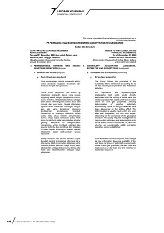 638 Laporan Tahunan %u2022 PT Pertamina Hulu EnergiLAPORAN KEUANGAN 7 FINANCIAL STATEMENTThe original consolidated financial statements included herein are in the Indonesian language.PT PERTAMINA HULU ENERGI DAN ENTITAS ANAKNYA/AND ITS SUBSIDIARIESDaftar 5/85 ScheduleCATATAN ATAS LAPORAN KEUANGANKONSOLIDASIANTanggal 31 Desember 2023 dan untuk Tahun yang Berakhir pada Tanggal Tersebut(Disajikan dalam ribuan dolar Amerika Serikat, kecuali dinyatakan lain)NOTES TO THE CONSOLIDATEDFINANCIAL STATEMENTS As of December 31, 2023and for the Year Then Ended(Expressed in thousands of United States dollars,unless otherwise stated)4. PERTIMBANGAN, ESTIMASI DAN ASUMSIAKUNTANSI SIGNIFIKAN (lanjutan)4. SIGNIFICANT ACCOUNTING JUDGMENTS, ESTIMATES AND ASSUMPTIONS (continued)b. Estimasi dan asumsi (lanjutan) b. Estimates and assumptions (continued)v. Aset minyak dan gas bumi v. Oil and gas propertiesGrup menerapkan metode successful effortsuntuk akuntansi kegiatan eksplorasi danevaluasi minyak dan gas bumi. The Group follows the principles of thesuccessful efforts method of accounting for itsoil and natural gas exploration and evaluationactivities.Untuk sumur eksplorasi dan sumur uji eksplorasi stratigrafi, biaya yang secara langsung terkait dengan pengeboran sumursumur tersebut, dikapitalisasi dahulu sebagai aset dalam pembangunan dalam akun aset minyak dan gas bumi, hingga ditentukan apakah telah ditemukan cadangan minyak dan gas yang berpotensi ekonomis berdasarkan pengeboran tersebut. Penentuan ini biasanya dilakukan dalam waktu satu tahun setelah penyelesaian sumur, tetapi dapat memakan waktu lebih lama, tergantung pada kompleksitas struktur geologi. Kebijakan ini mengharuskan manajemen untuk membuat estimasi dan asumsi tertentu atas peristiwa dan keadaandi masa depan, khususnya apakah operasi eksploitasi dapat dilaksanakan secara ekonomis. For exploration and exploratory-type stratigraphic test wells, costs directlyassociated with the drilling of those wells areinitially capitalized as assets under construction within oil and gas properties, pendingdetermination of whether potentiallyeconomically viable oil and gas reserves havebeen discovered by the drilling effort. Thedetermination is usually made within one yearafter well completion, but can take longer,depending on the complexity of the geologicalstructure. This policy requires management tomake certain estimates and assumptions as tofuture events and circumstances, in particularwhether an economically viable extractionoperation can be established. Setiap estimasi dan asumsi tersebut dapat berubah seiring tersedianya informasi baru. Jika sumur tidak menemukan cadangan yang memiliki potensi ekonomi, biaya sumur akan dibebankan sebagai beban sumur kering (dry hole) dan diklasifikasikan sebagai biaya eksplorasi.Such estimates and assumptions may change as new information becomes available. If the well does not discover potentially economically viable oil and gas quantities, the well costs are expensed as a dry hole and are reported in exploration expense.