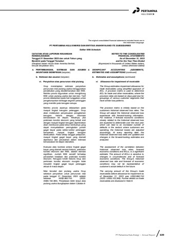 PT Pertamina Hulu Energi %u2022 Annual Report 639The original consolidated financial statements included herein are in the Indonesian language.PT PERTAMINA HULU ENERGI DAN ENTITAS ANAKNYA/AND ITS SUBSIDIARIESDaftar 5/86 ScheduleCATATAN ATAS LAPORAN KEUANGANKONSOLIDASIANTanggal 31 Desember 2023 dan untuk Tahun yang Berakhir pada Tanggal Tersebut(Disajikan dalam ribuan dolar Amerika Serikat,kecuali dinyatakan lain)NOTES TO THE CONSOLIDATEDFINANCIAL STATEMENTSAs of December 31, 2023and for the Year Then Ended(Expressed in thousands of United States dollars,unless otherwise stated)4. PERTIMBANGAN, ESTIMASI DAN ASUMSI AKUNTANSI SIGNIFIKAN (lanjutan)4. SIGNIFICANT ACCOUNTING JUDGMENTS, ESTIMATES AND ASSUMPTIONS (continued)b. Estimasi dan asumsi (lanjutan) b. Estimates and assumptions (continued)vi. Penyisihan atas penurunan nilai piutang vi. Allowance for impairment of receivableGrup menetapkan estimasi penyisihan penurunan nilai piutang usaha menggunakan pendekatan yang disederhanakan dari KKE. Matriks provisi digunakan untuk menghitung KKE untuk piutang usaha dan lain-lain. Tarif provisi didasarkan pada hari tunggakan untuk pengelompokan berbagai segmen pelanggan yang memiliki pola kerugian serupa.The Group estimates impairment allowance for trade receivables using simplified approach of ECL. A provision matrix is used to determine ECL for trade and other receivables, where the provision rates are based on days past due for groupings of various customer segments that have similar loss patterns.Matriks provisi awalnya didasarkan pada riwayat tingkat kerugian pelanggan. Grup akan melakukan penyesuaian pengalaman kerugian historis dengan informasi berwawasan ke depan. Misalnya, jika prakiraan kondisi ekonomi yang terkait erat dengan riwayat tingkat kerugian diperkirakan akan memburuk pada tahun berikutnya yang dapat menyebabkan peningkatan jumlah gagal bayar pada sektor-sektor pelanggan beroperasi, riwayat tingkat kerugian disesuaikan. Pada setiap tanggal pelaporan, riwayat tingkat gagal bayar yang diamati diperbarui dan perubahan dalam estimasi berwawasan ke depan dianalisis.The provision matrix is initially based on the customers historical observed loss rates. The Group will adjust the historical observed loss experience with forward-looking information. For instance, if forecast economic conditions closely related to the historical observed loss are expected to deteriorate over the next year which can lead to an increased number of defaults in the sectors where customers are operating, the historical losses are adjusted accordingly. At every reporting date, the historical observed loss rates are updated and changes in the forward-looking estimates are analyzed.Evaluasi atas korelasi antara tingkat gagal bayar yang diamati secara historis, prakiraan kondisi ekonomi dan KKE, adalah estmasi signifikan. Jumlah KKE sensitif terhadap perubahan keadaan dan prakiraan kondisi ekonomi. Kerugian kredit historis Grup dan perkiraan kondisi ekonomi mungkin tidak mewakili tingkat gagal bayar pelanggan aktual di masa depan.The assessment of the correlation between historical observed loss rates, forecast economic conditions and ECLs, is a significant estimate. The amount of ECLs is sensitive to changes in circumstances and of forecast economic conditions. The Group%u2019s historical observed loss rate and forecast of economic conditions may not be representative of customer%u2019s actual default in the future.Nilai tercatat dari piutang usaha Grup sebelum penyisihan untuk penurunan nilai pada tanggal 31 Desember 2023 adalah sebesar AS$2.860.743 (2022: AS$5.102.365). Penjelasan lebih lanjut atas piutang usaha diungkapkan dalam Catatan 8The carrying amount of the Group%u2019s trade receivables before allowance for impairment as of December 31, 2023 was US$2,860,743 (2022: US$5,102,365). Further details on trade receivables are disclosed in Note 8.